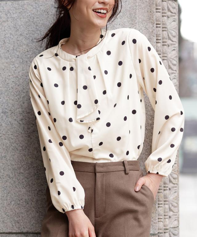 レトロさのあるドット柄が大人可愛いボウタイブラウス。身頃は裏起毛の裏地付なので、重ね着をしなくても暖か。着膨れしにくいので、ジャケットやカーディガンのインナーにも最適!