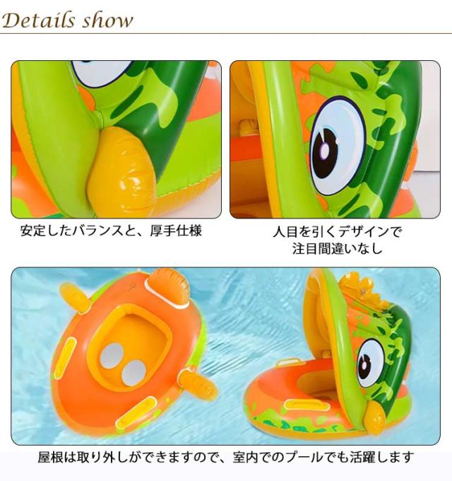 | 夏のプール・ビーチで大活躍! 人目を引くデザインで注目間違いなし。 独特の屋根付き、日陰ができ熱中症や日焼けの予防になります。 屋根は取り外しができますので、室内でのプールでも活躍します。 足入れ式のデザインのため、 赤ちゃんも安心して水遊びができます。 | |