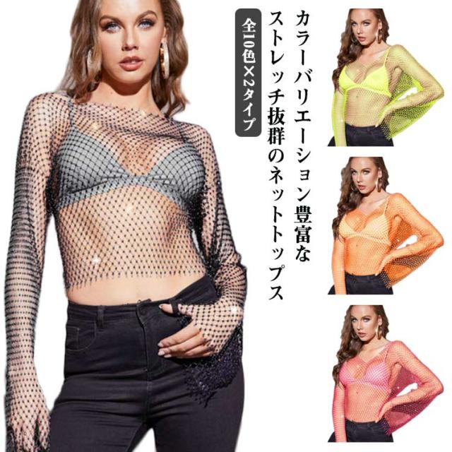 全10色×2タイプ レディース ダンス 衣装 メッシュ トップス ショート丈 ランドネック Vネック トップス シースルー カットソー 長袖 キラキラ へそ出し トップス 透け感 おしゃれ かっこいい セクシー 黒