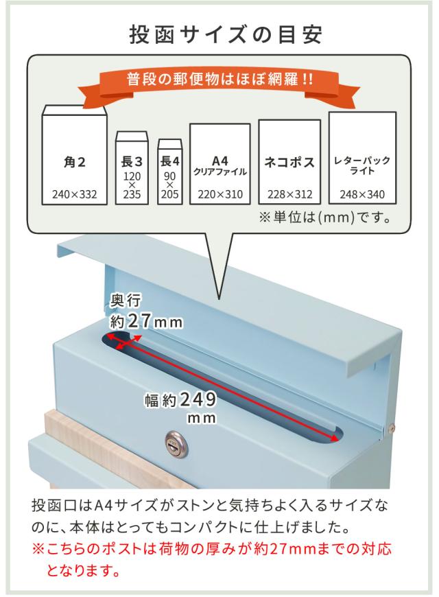 | ■サイズ(約) | 本体:幅300×奥行110×高さ365mm 投函口:幅249×奥行27mm |