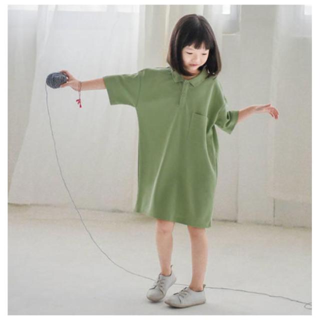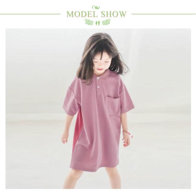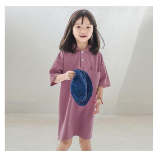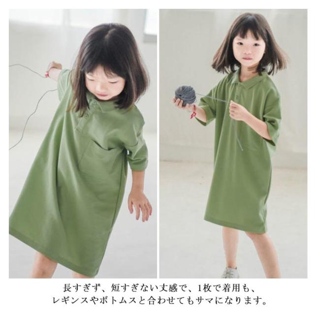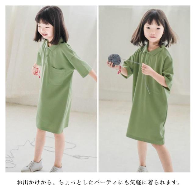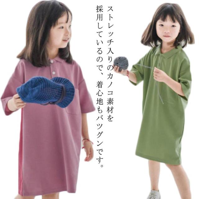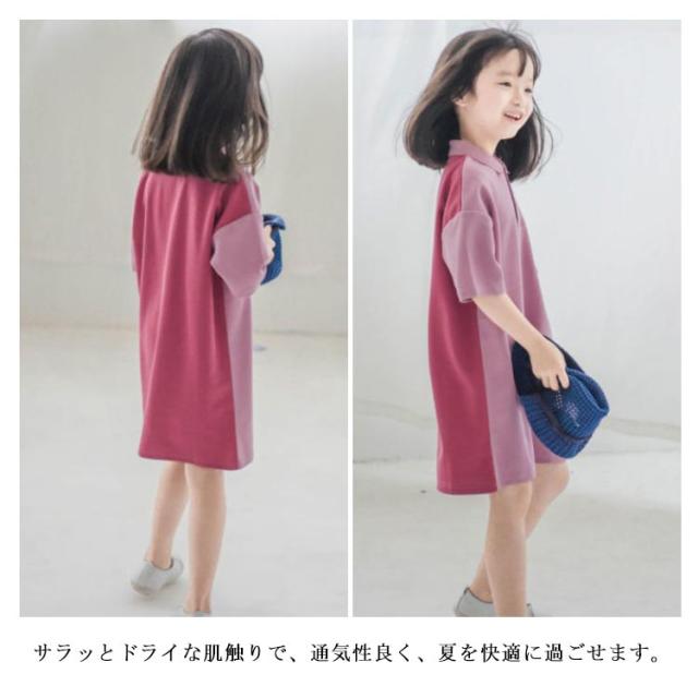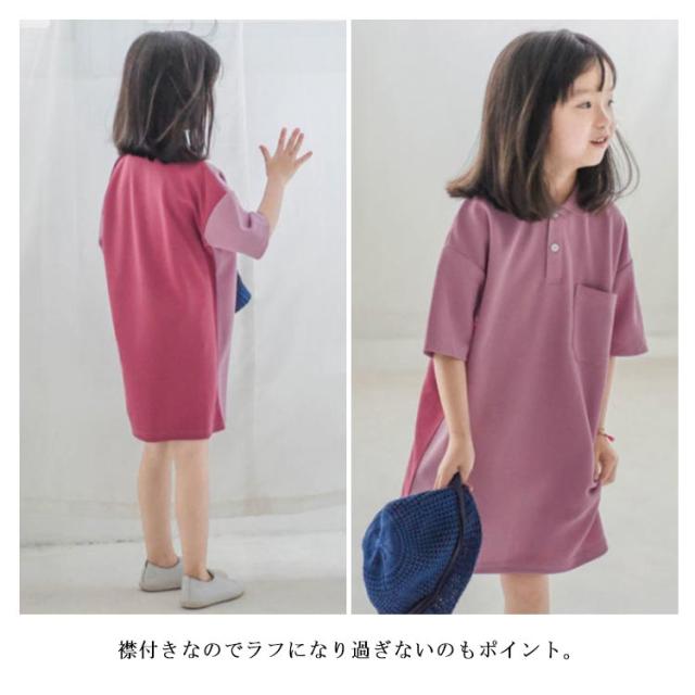 【送料無料】キッズ ポロワンピース 鹿の子 配色 半袖 子ども ワンピース ポロワンピ 女の子 吸水 速乾 綿 無地 春夏 ポケット付き シンプル かわいい 90 100 110 120 130 140 韓国子供服 パープル グリーン