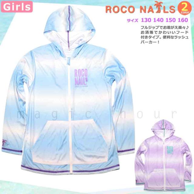 ◆ ラッシュガード キッズ ジュニア ガールズ 長袖 ROCO NAILS ロコネイル UVカット フルジップ フード付き ラッシュ UPF50+ ◆