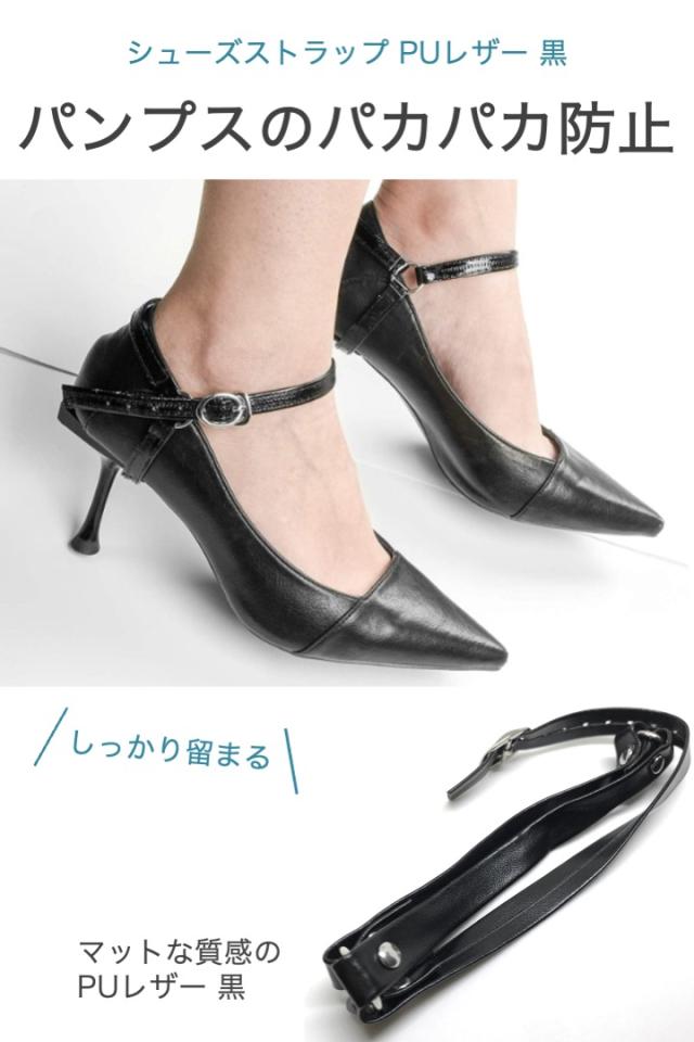 シューズストラップ PUレザー 黒 1組セット 脱げ防止 パカパカ防止 パンプスストラップ シューズバンド しっかり 固定 かかと フィット 補助 簡単 着脱 留めるだけ 歩きやすい パンプス ストラップ シューズ ストラップ ホールド ベルト シンプル