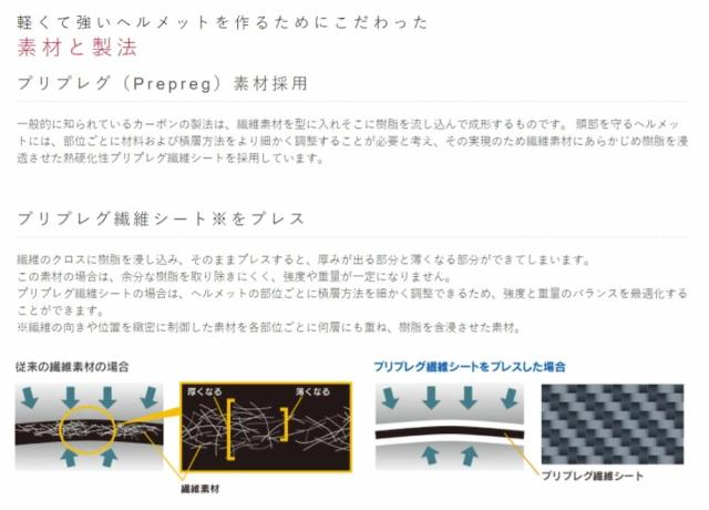 一般的に知られているカーボンの製法は、繊維素材を型に入れそこに樹脂を流し込んで成形するものです。 頭部を守るヘルメットには、部位ごとに材料および積層方法をより細かく調整することが必要と考え、その実現のため繊維素材にあらかじめ樹脂を浸透させた熱硬化性プリプレグ繊維シートを採用しています。