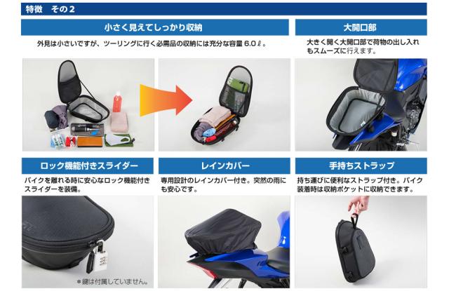 外見は小さいですが、ツーリングに行く必需品の収納には充分な容量6.0リットル。