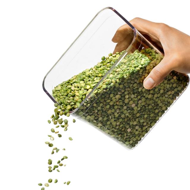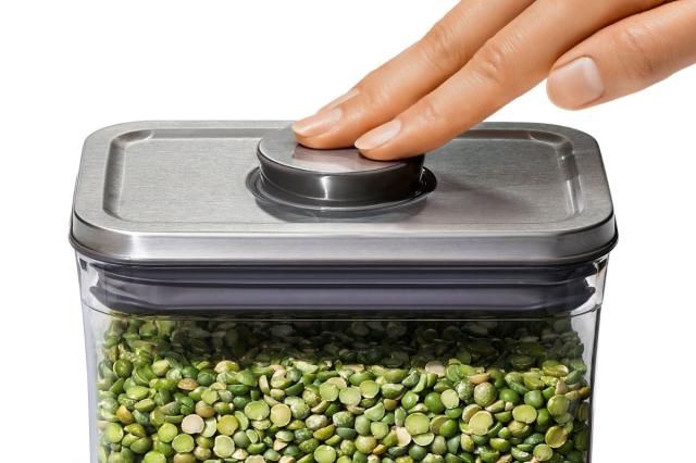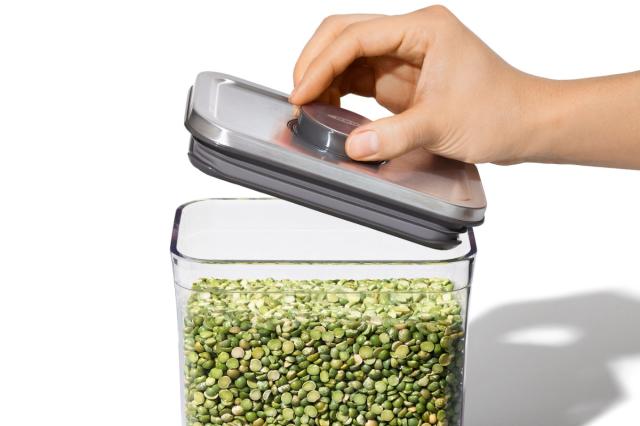 フタの真ん中についているボタンを押すだけで開閉ができ、ポップアップしたボタンはそのままハンドルとして使えるドライフード用の保存容器です。調理中や、片手がふさがっていてもワンタッチ操作で開閉が可能です。中に何が入っているかすぐにわかり、残量も一目で確認できます。