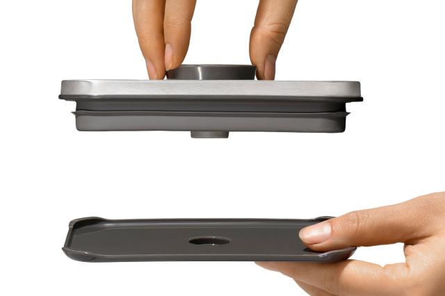 フタの革新的な内部構造でしっかりとした密閉力を実現しています。コンテナのフタボタンを押すと中の枠が横に拡がって、柔らかいシリコーンのひだが、幅広く密着し密閉してくれます。シリコーンはフタの内側全体を覆っているので、粉などが入りにくいです。