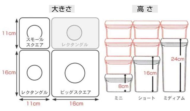 高さはミニを基準にミニの2倍がショート、3倍がミディアムと全てのフタの形に共通しているので、カウンターや戸棚の中でスッキリ整理整頓ができます。サイズ違いでもきれいにスタッキング(積み重ねて収納)ができます。