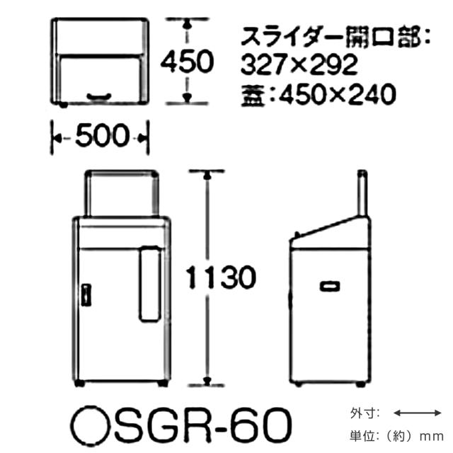 | 材質 | ボディー:ボンデ鋼板アクリル焼付、一部ABS 内カゴ:ワイヤPEコーティング 蓋:アクリル板(スモーク) 窓:アクリル板(クリア) 看板:PVC |