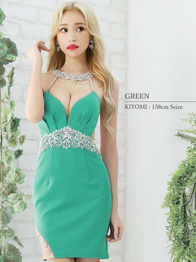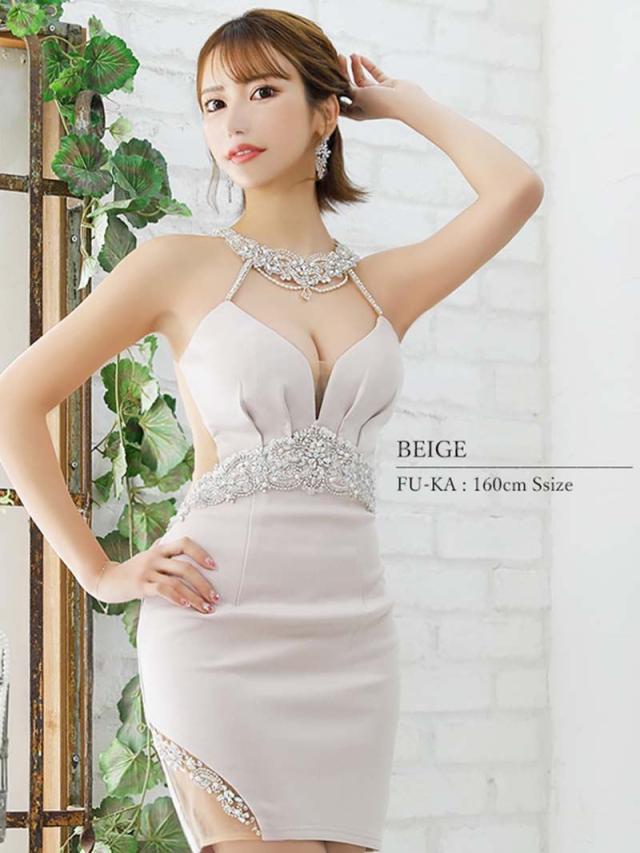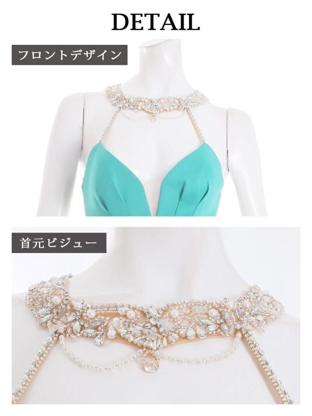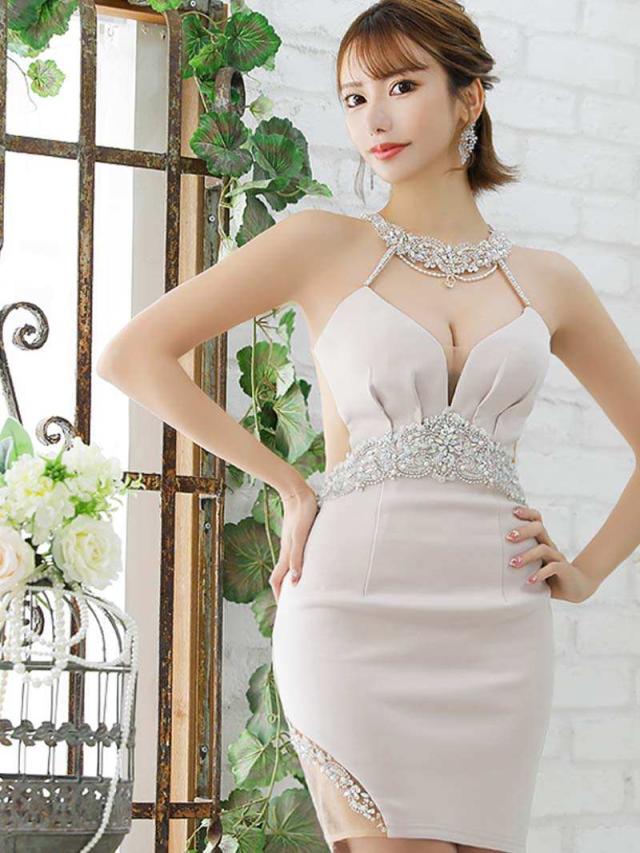 ☆首元からバストにかけてアクセサリーのように輝くビジューがラグジュアリー感たっぷりのホルターネックドレスは暗めの照明が多いキャバクラや高級クラブでもお顔周りを明るく華やかに魅せてくれます♪