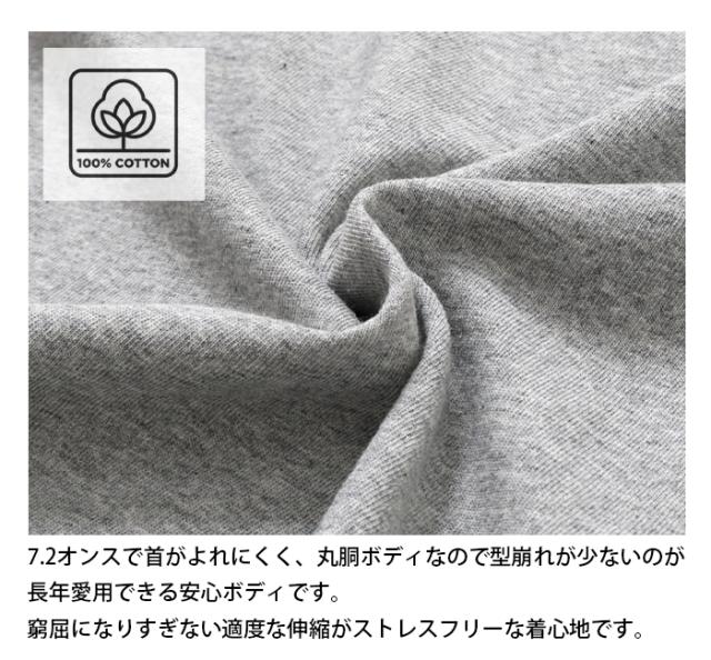 7.2オンスで首がよれにくく、サイドの縫い目がなく、型崩れが少ない丸胴ボディで長年愛用していただけます。