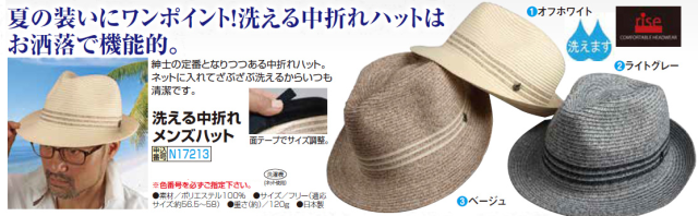 中折れ帽 中折ハット メンズ 日本製 洗える中折れメンズハット 全3色 帽子 ハット 紳士 シニア オフホワイト ベージュ ライトグレー サマーハット シニアファッション 40代 50代 60代 70代 80代 ギフト 父の日 お父さん 春物 夏物 春夏 サマー mk p17213 p27083