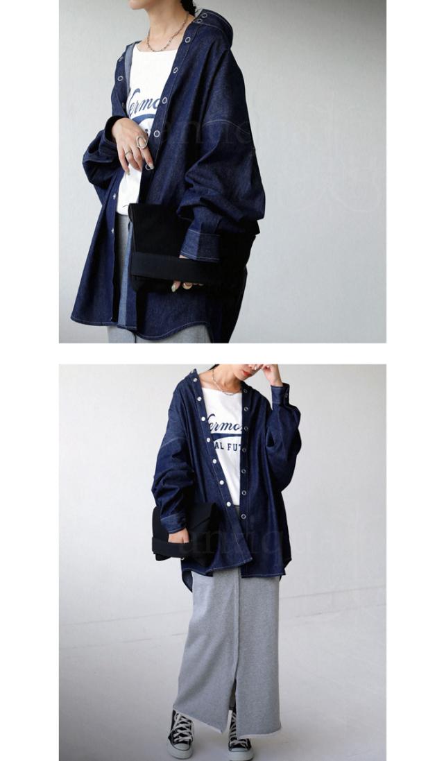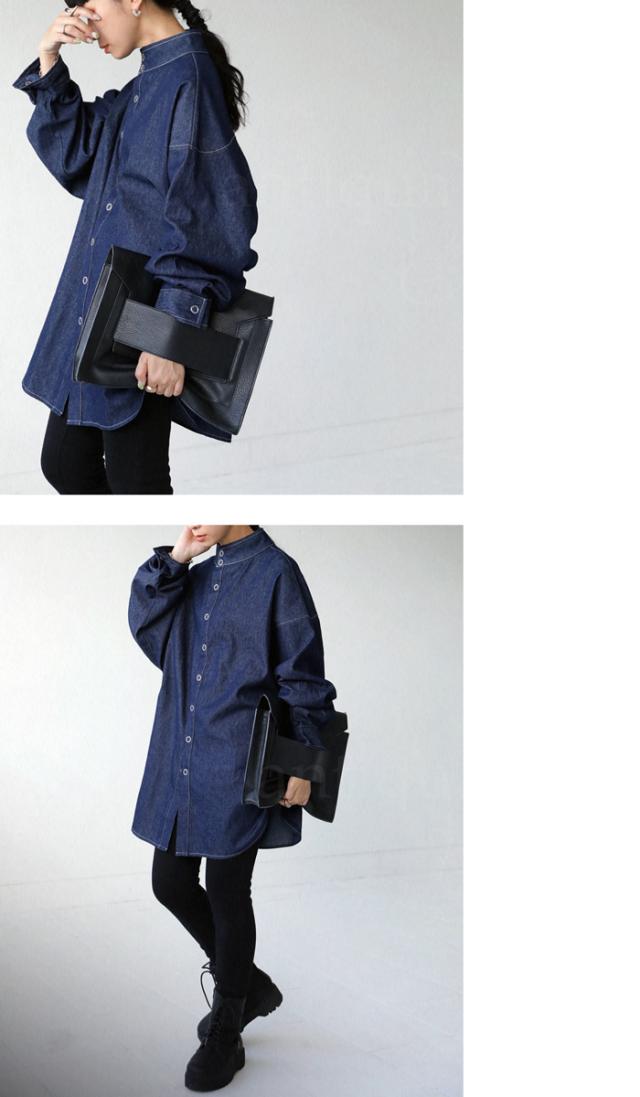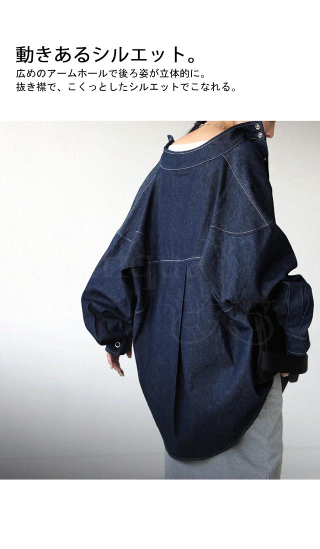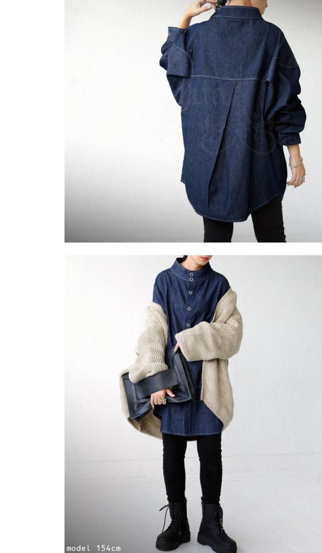 zk-00100u シャツ 長袖 綿100 デニム 羽織り デニムジャケット スタンドネック スナップボタン タック 切替え 立体感 配色ステッチ コットン ゆったり 大きいサイズ ユニセックス