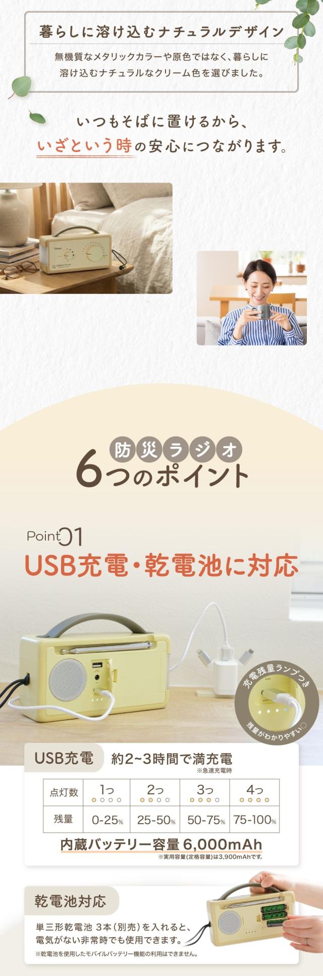 お部屋のインテリアにも合う、ナチュラルなクリーム色のデザイン。 災害時に役立つ機能をしっかり搭載した多機能な防災ラジオライトです。