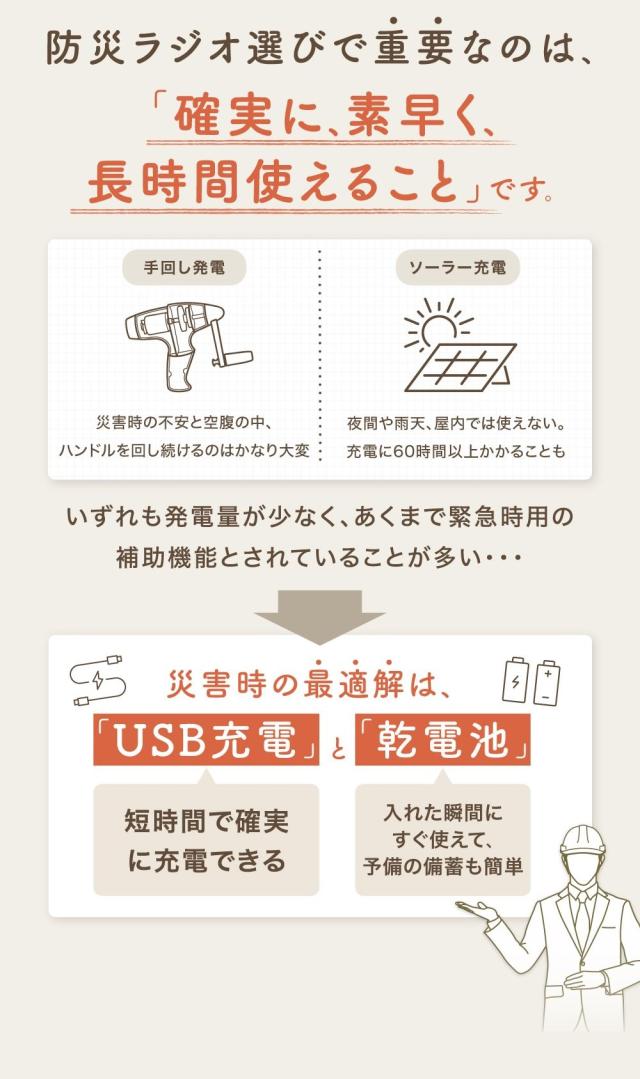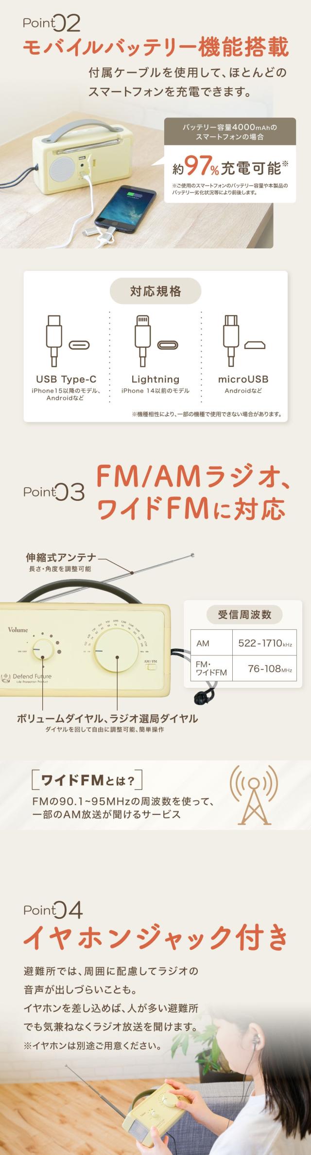 AM・FMに加え、災害時の情報収集に有利なワイドFMにも対応。伸縮式アンテナで感度よく受信します。 イヤホンジャック搭載のため、人が多い避難所でも周囲に気兼ねなく情報を聞くことができます。