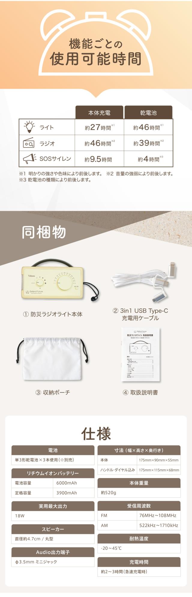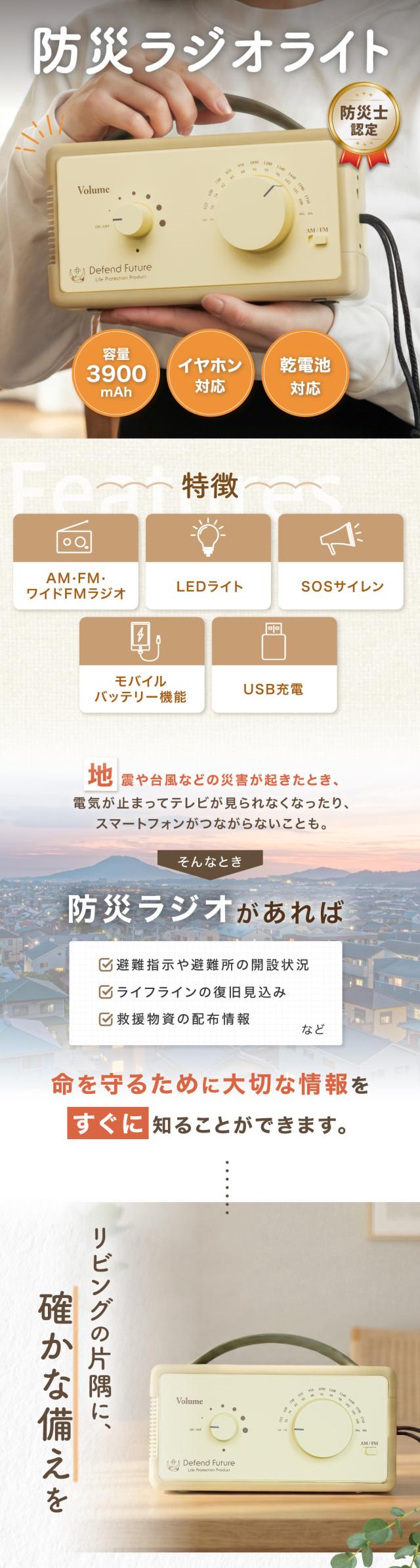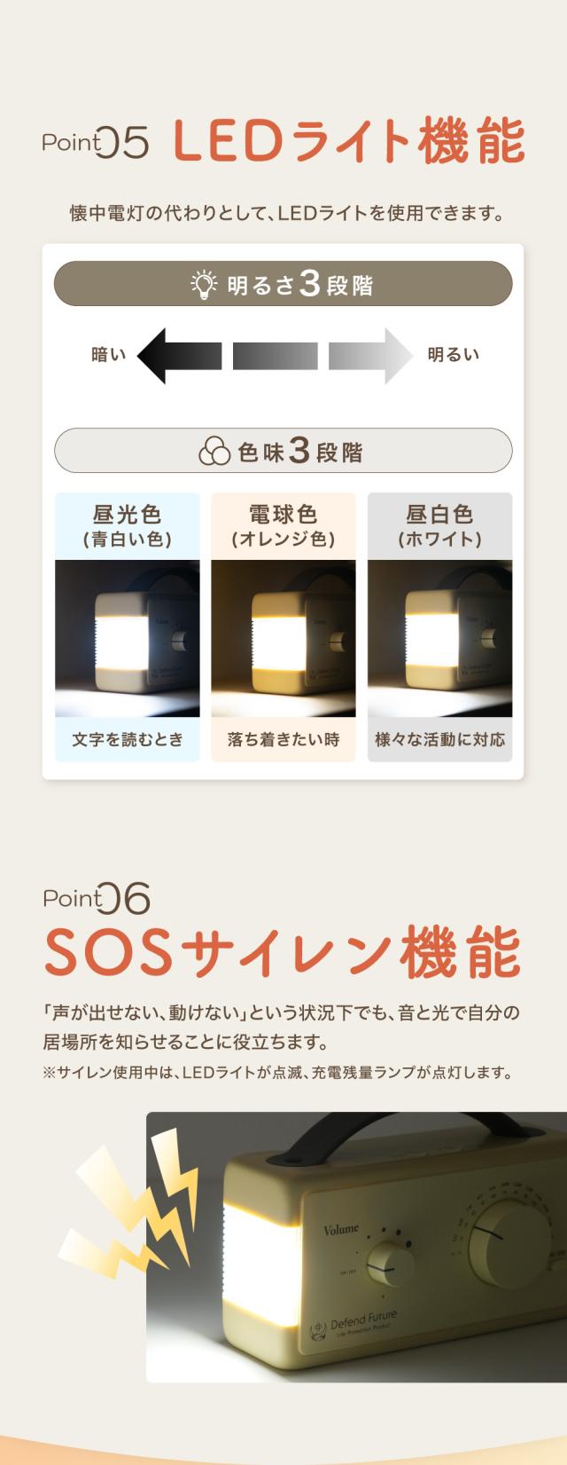 防災ラジオ ライト 充電式 小型 FM / AM 対応 スマホ 充電 懐中電灯 LEDライト SOSアラート 多機能 Defend Future