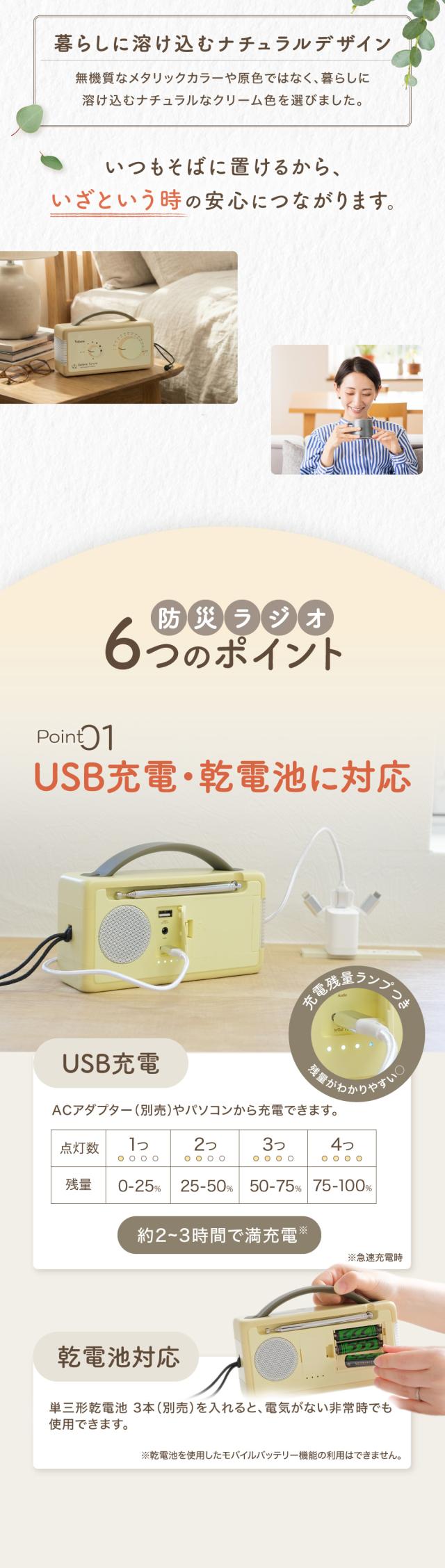 お部屋のインテリアにも合う、ナチュラルなクリーム色のデザイン。 災害時に役立つ機能をしっかり搭載した多機能な防災ラジオライトです。