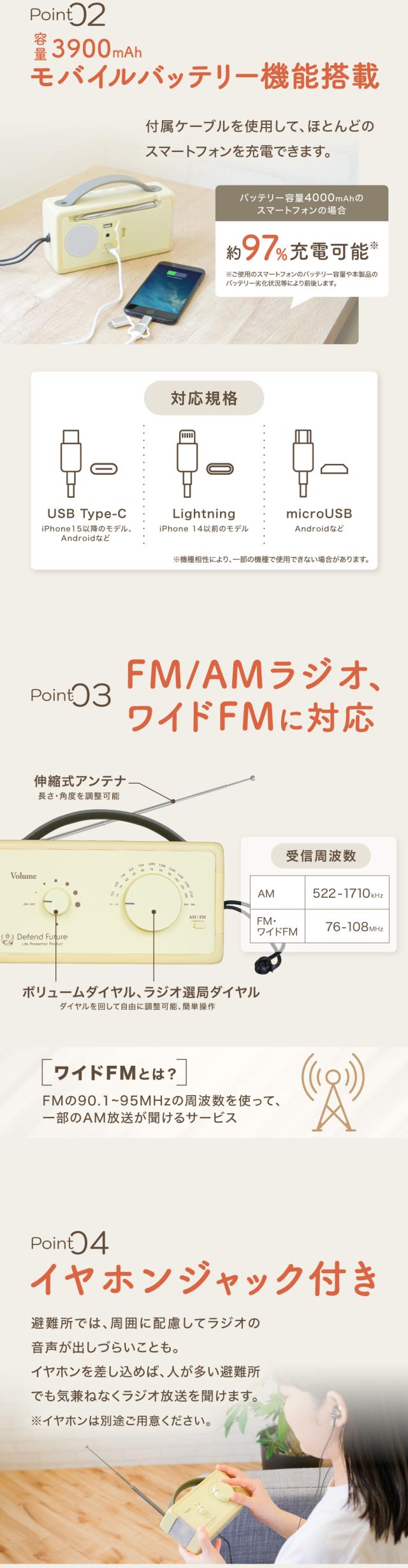 AM・FMに加え、災害時の情報収集に有利なワイドFMにも対応。伸縮式アンテナで感度よく受信します。 イヤホンジャック搭載のため、人が多い避難所でも周囲に気兼ねなく情報を聞くことができます。