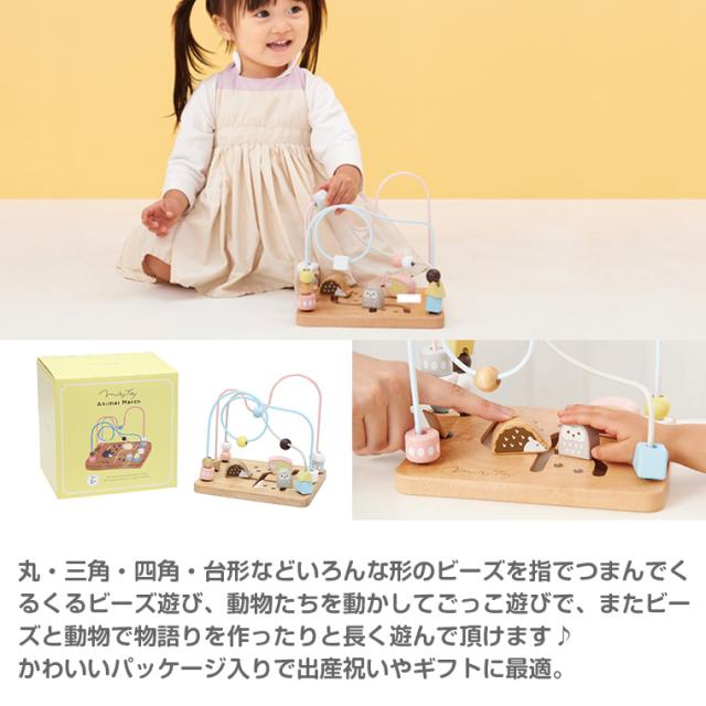 丸・三角・四角・台形などいろんな形のビーズを指でつまんでくるくるビーズ遊び、動物たちを動かしてごっこ遊びで、またビーズと動物で物語りを作ったりと長く遊んで頂けます。