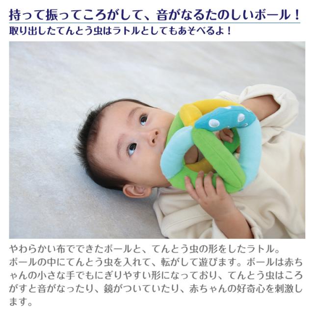【特徴】やわらかい布でできたボールと、てんとう虫の形をしたラトル。ボールの中にてんとう虫を入れて、転がして遊びます。
