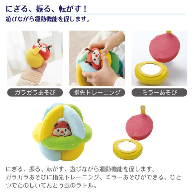 ボールは赤ちゃんの小さな手でもにぎりやすい形になっており、てんとう虫はころがすと音がなったり、鏡がついていたり、赤ちゃんの好奇心を刺激します。