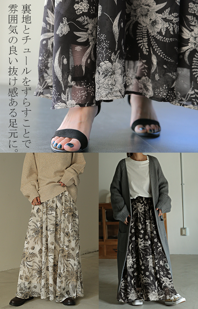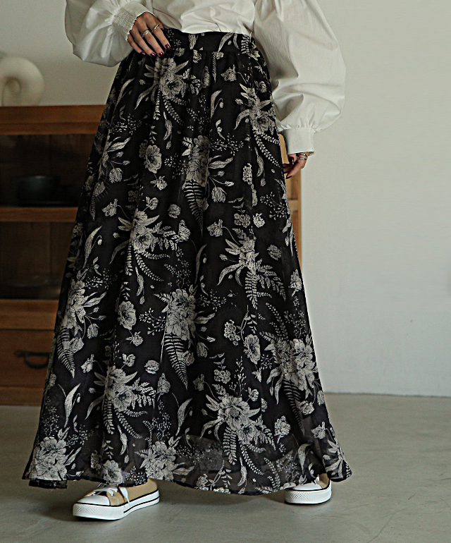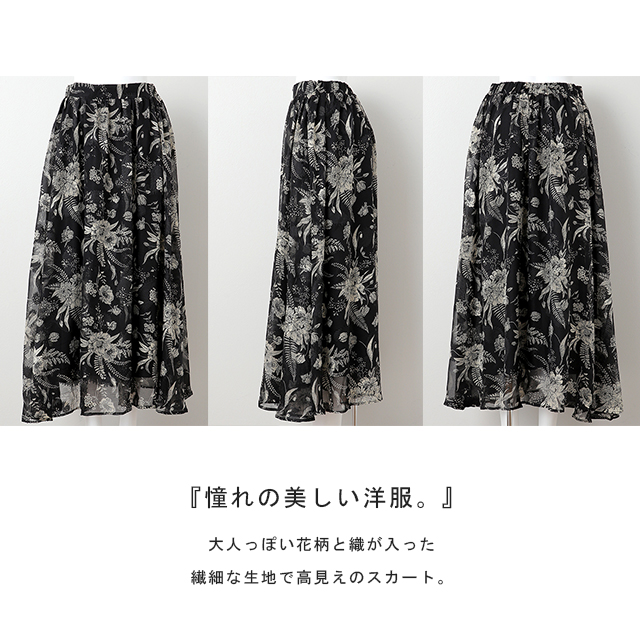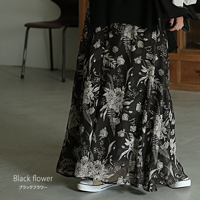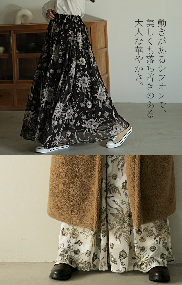 スカート 「ふわっと 柄 浮かび上がる」 シフォン ロングスカート ボトムス 花柄 大柄 小花柄 レディース フレア フレアスカート ロング ギャザースカート ドレープ ゴム リーフ柄 長い Aラインスカート Aライン マキシスカート 黒 HUG.U 冬 秋 秋新作