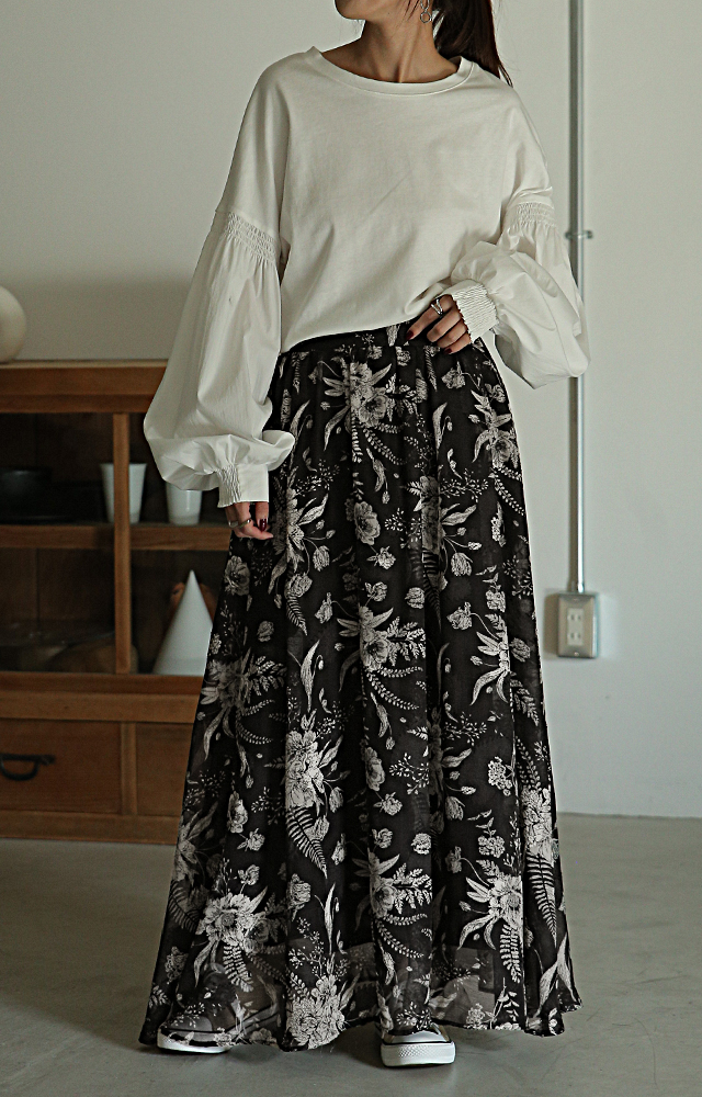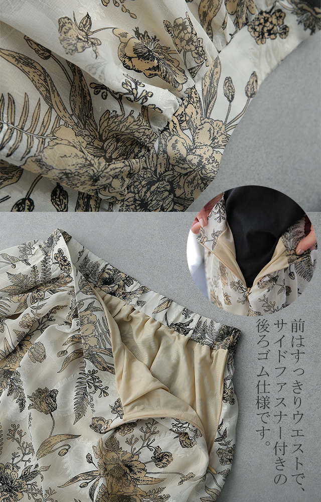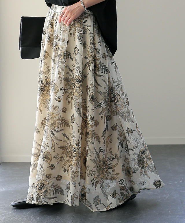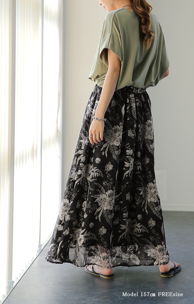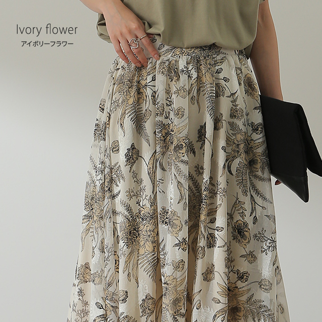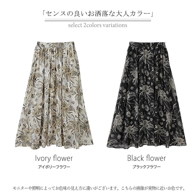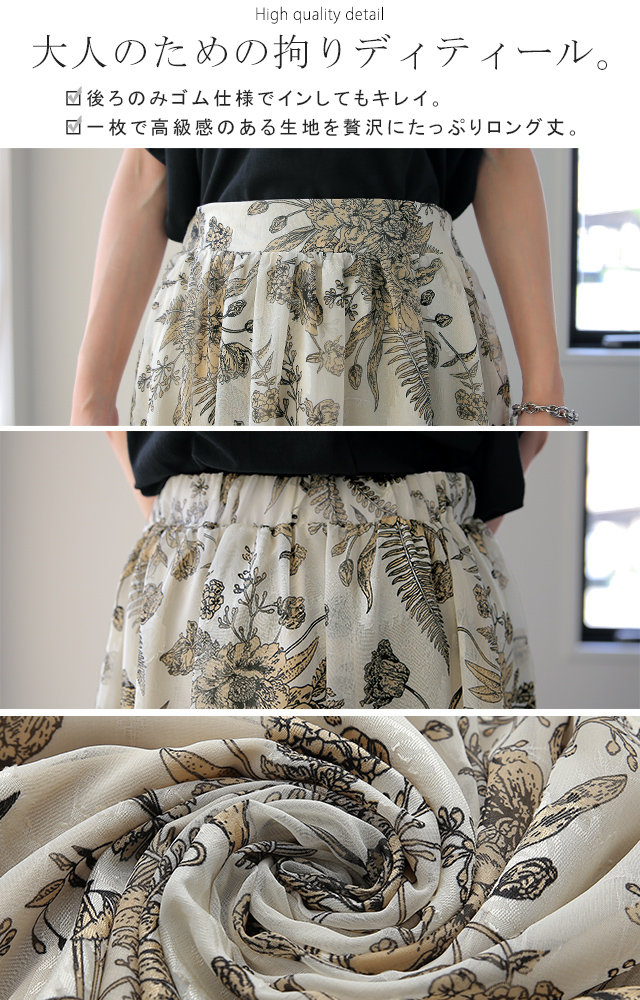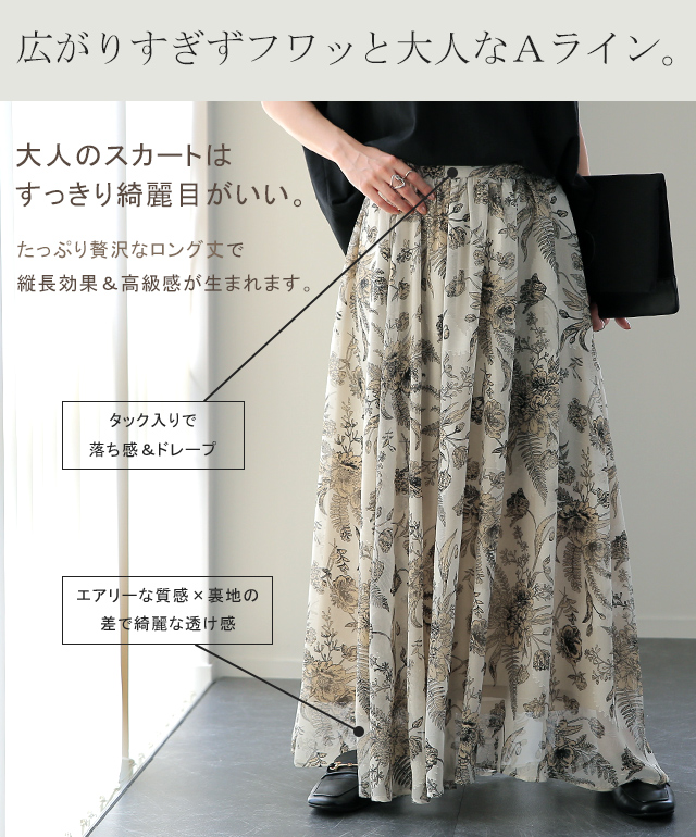 シアー スカート ロングスカート シフォン ロング レデ ィ—ス マキシ マキシスカート ロング丈スカート マキシ丈スカート ボトムス ボトム 上品 レディースファッション シフォンスカート 透け感 透け シースルー 艶 艶感 光沢 光沢感 光沢スカート シャイニー 花 花柄スカート 小花柄スカート 総柄スカート 総柄 柄スカート ボタニカル柄 ペイズリー ペイズリー柄 フラワー 着痩せ 長い 長め タック 裏地 トレンド Aライン Aラインスカート フレア フレアスカート フラワー フェミニン ガーリー デート モノトーン ゴムウエスト ゴムウェスト ウエストゴム ウェストゴム ゴム パーティー パーティ 二次会 ランチ お出かけ リゾート ビーチ 海 旅行 飛行機 シースルー シアー 透け感 重ね着 重ね 着回し 体型カバー 大きいサイズ プラスサイズ ビッグ ビック big ビックシルエット ビッグシルエット ビックサイズ ビッグサイズ オーバーサイズ オーバー 着痩せ 大き目 大きい 大きめ フリーサイズ フリー S M L LL 2L XL 3L XXL LLL ゆったり ゆる ゆったりサイズ ラクチン らくちん 楽ちん 楽 動きやすい トール丈 トール トールサイズ 高身長 170cm パーティー パーティ 二次会 ランチ デート お出かけ リゾート ビーチ 海 旅行 飛行機 カジュアル ナチュラル 大人カジュアル ベーシック オフィス オフィスカジュアル テレワーク リモートワーク リモート オンライン飲み会 おうち時間 お家時間 華やか 母の日 プレゼント ギフト 贈り物 クリスマス シンプル 大人 大人カジュアル オトナ 女性 綺麗 綺麗目 きれい キレイ キレイめ キレイメ きれいめ 高見え 上質 20代 30代 40代 50代 おしゃれ お洒落 オシャレ 可愛い かわいい カワイイ カッコいい 格好良い カッコイイ 黒 黒色 ブラック ブラックフラワー 白 白色 ホワイト アイボリー アイボリーフラワー エクリュ キナリ 生成り 生成り色 ベージュ 春 夏 秋 冬 春夏 秋冬 HUG.U HUGU ハグユー はぐゆー