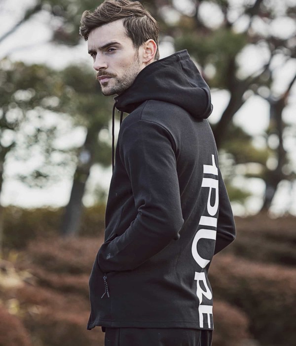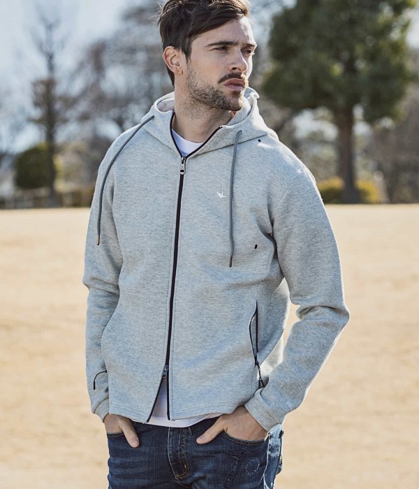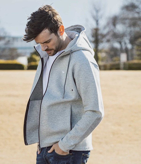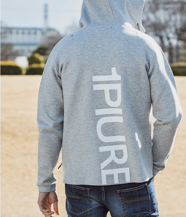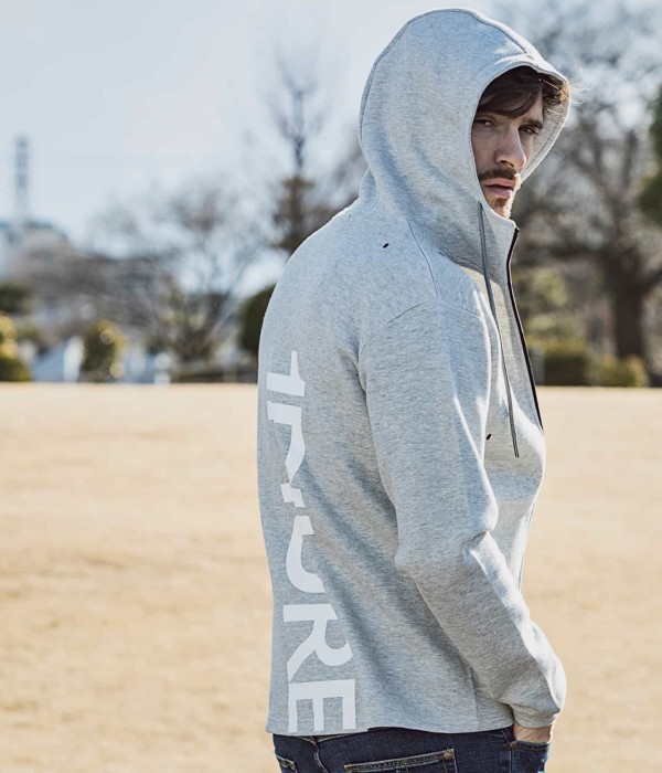 バックにキャッチーで大胆な大きなブランドロゴを配置したフーディー。胸元にはブランドシンボル「折り鶴」をシリコンプリントであしらいました。ファスナーを全部上げるとハイネックフーディーになるところもポイント。冷たい空気もシャットアウト。