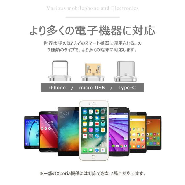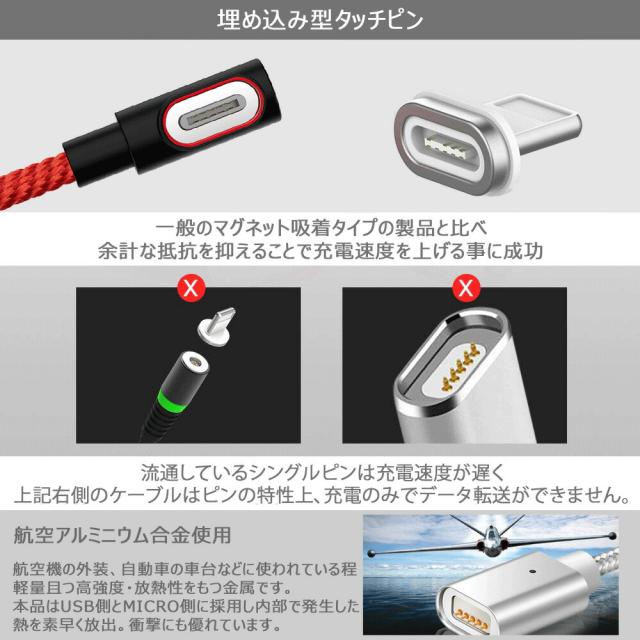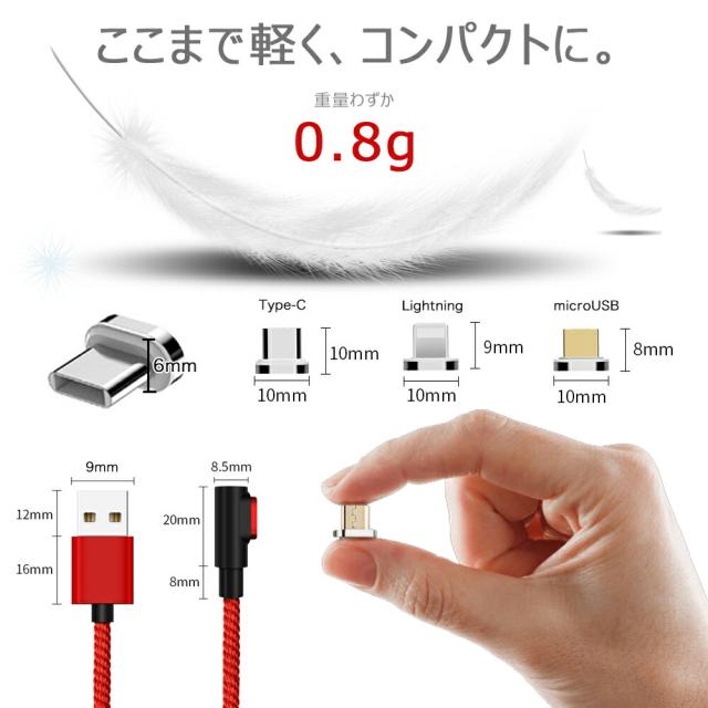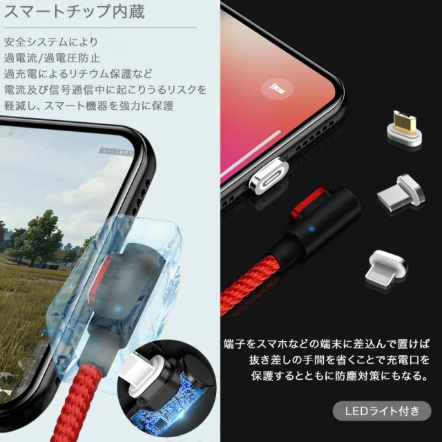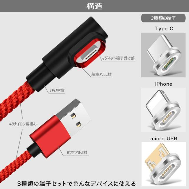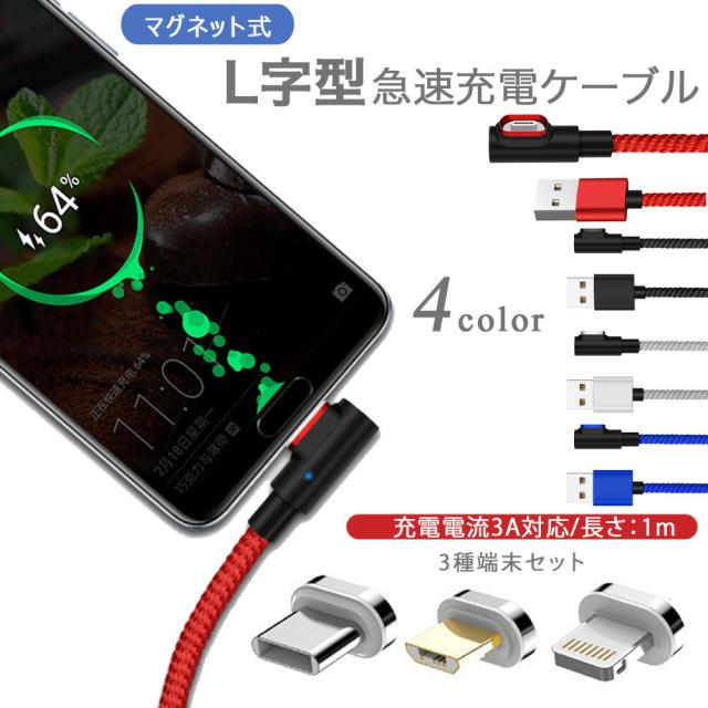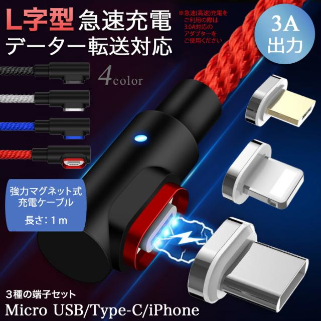 【4点セット】L字型 3in1 高速充電ケーブル データ転送 磁石 マグネット式ケーブル 1m QC3.0 9V 対応 アイフォン アンドロイド スマホ タブレット iPad 3A iPhone type-c マイクロUSB タイプc usbケーブル micro usb 急速充電 ライトニング 高耐久 ナイロン 断線防止 防塵