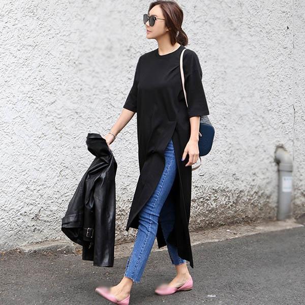 スリット ロングTシャツ ロングtシャツ レディース 半袖 膝下 夏 Tシャツ ワンピース ロンT コットン ブラック tシャツワンピ ゆるワンピ 大人シンプル 無地 クルーネック レディース 20代 30代 40代d1286s1s1c9