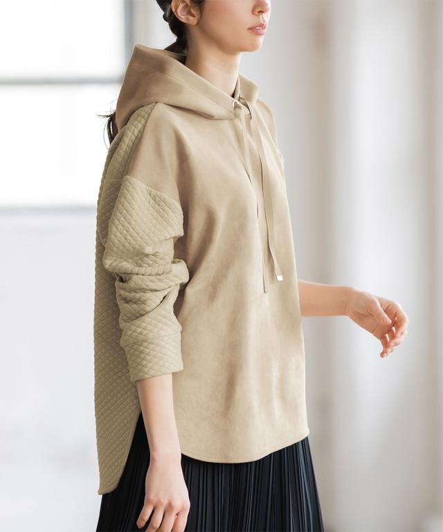 キルト素材で切り替えたきれい見え大人パーカートレンドのキルト素材を切り替えたフードパーカー。異素材を組み合わせた微配色で、カジュアル感を抑え大人っぽく着られる。