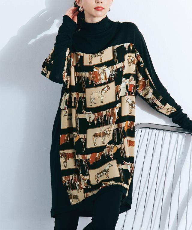 着るだけで素敵な女性になれる迫力のあるエレガンスな魅力スカーフ柄のプリント生地を切り替えたニットソーチュニック。ゆるっとしたシルエットで体型をカバー。