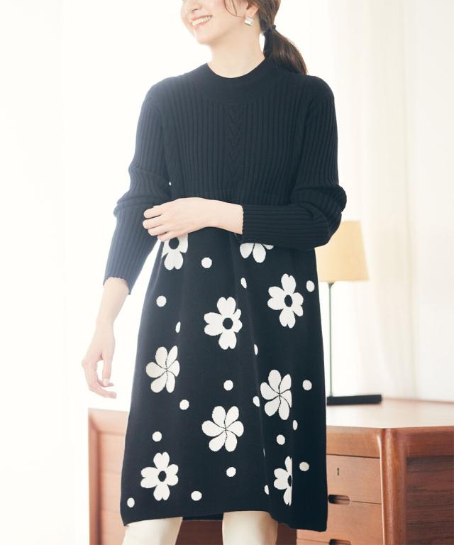おめかし気分でキメる甘モチーフ&シルエット花とドットのモチーフが目を引くニットトップス。胸元から上はリブ編み、スカート部分はジャカード編みで切り替え、すっきりと装えます。