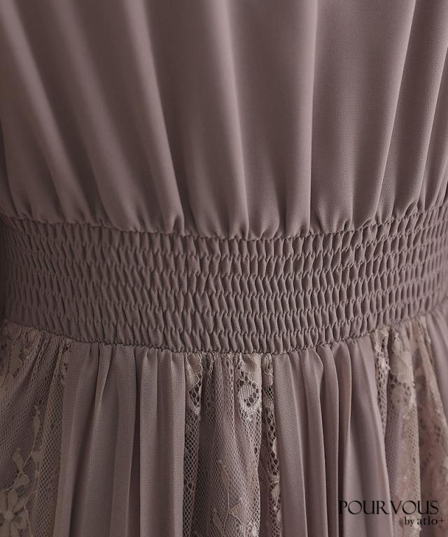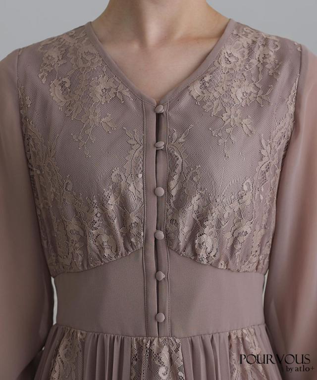 柔らかな印象をあたえるシフォン生地感と総レースが華やか。スカートのレースとシフォンプリーツの切り替えがかわいい一着です。
