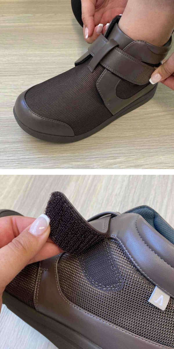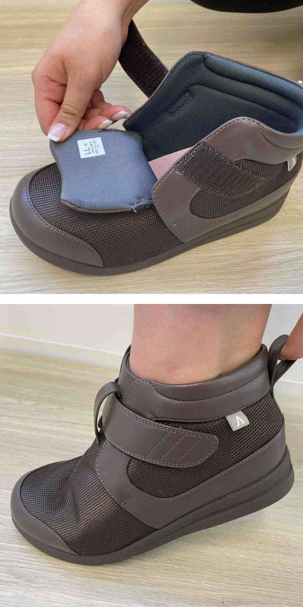 甲・足首まわりのベルトで靴と足がぴったりフィットします。靴の中で足を正しいポジションにセットし、一体化することで歩行をサポートします。ベルトが面ファスナーで、簡単に調節が可能です。ゆったりとしたつま先に加え、足囲・足幅も3Eサイズなので履いていて楽です。