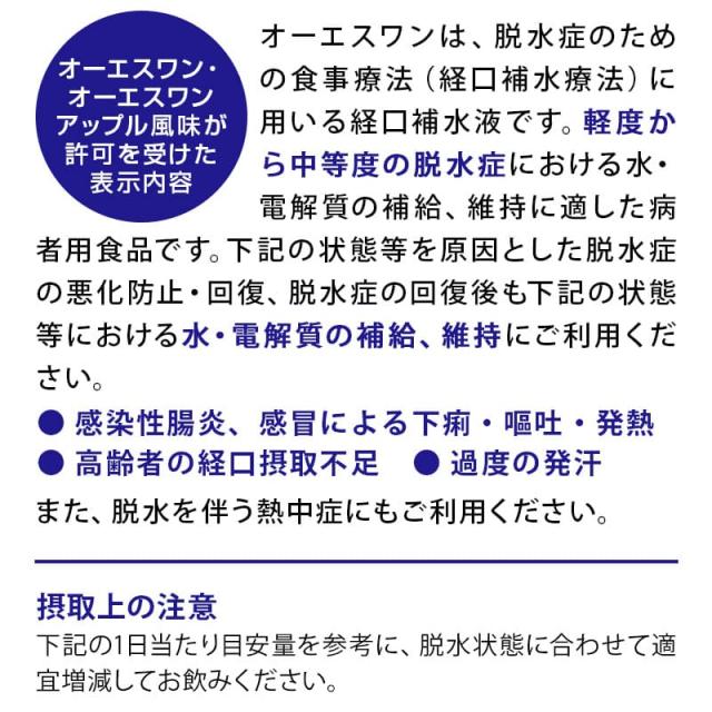 | 商品詳細 | オーエスワンは、脱水症のための食事療法(経口補水療法)に用いる経口補水液です。軽度から中等度の脱水症における水・電解質の補給、維持に適した病者用食品です。 ・オーエスワンシリーズは同じ糖・電解質濃度 ・高齢者の経口摂取不足に ・過度の発汗に ・脱水を伴う熱中症に 【味/香り】アップル風味 |