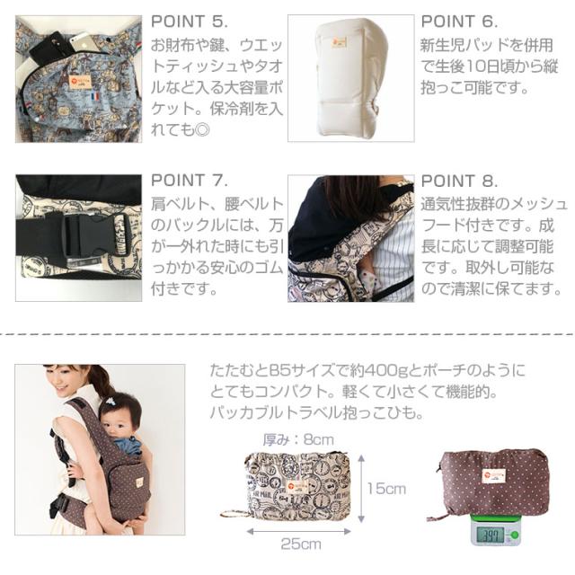 「コンパクトシリーズ」は、本格的腰ベルトタイプの抱っこ紐にもかかわらず、たたむとB5サイズで400gと、ポーチのようにとてもコンパクトに。