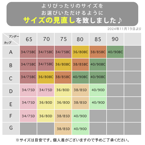 34/75BC(A65/A70/A75/B65/B70/C65対応) 36/80BC(A80/B75/C70対応) 38/85BC(A85/B80/C75対応) 40/90BC(A90/B85/C80/C85対応) 34/75D(D65/D70/E65/F65対応) 36/80D(D75/E70/E75/F70対応) 38/85D(D80/E80/F75/G75対応) 40/90D(D85/E85/F80/G80対応) |