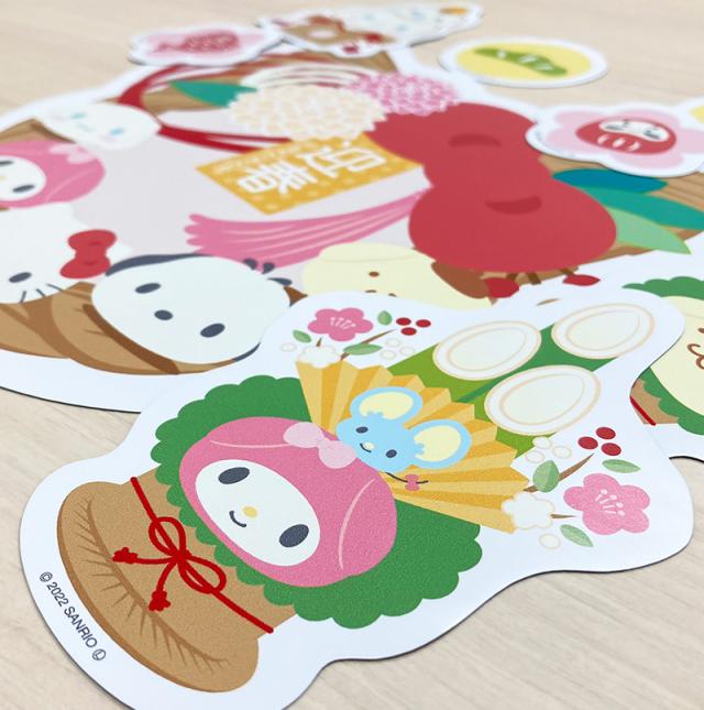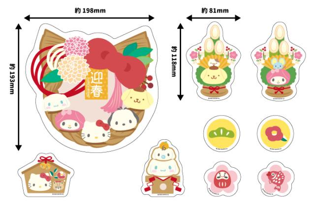 門松にはポムポムプリンとマフィン、マイメロディとフラットくん、絵馬にはハローキティとタイニーチャム、鏡餅にはシナモロールとみるくがデザインされています♪