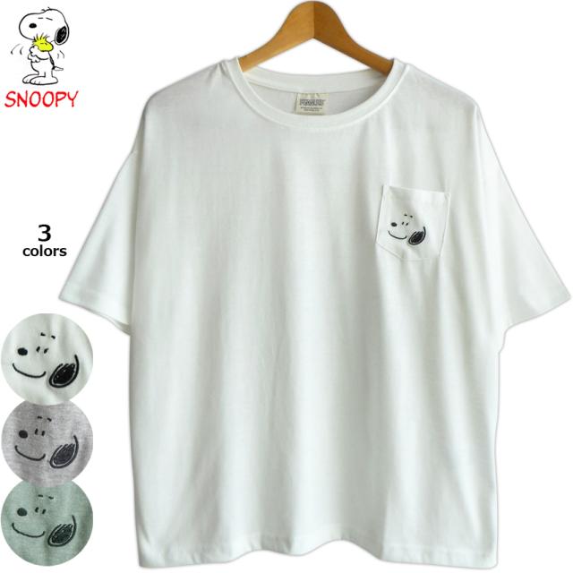 送料無料 Tシャツ スヌーピー レディース メンズ ポケット 刺繍 シンプル スヌーピーフェイス かわいい snoopy peanuts 定番ワイドビッグサイズ ペアルック 霜降り 白 グレー グリーン くすみカラー ボーイフレンドTシャツ 男女兼用
