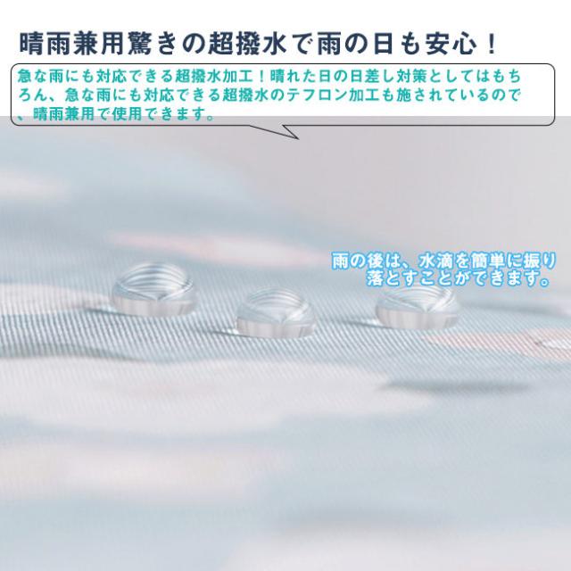 【晴雨兼用驚きの超撥水で雨の日も安心!】急な雨にも対応できる超撥水加工!晴れた日の日差し対策としてはもちろん、急な雨にも対応できる超撥水のテフロン加工も施されているので、晴雨兼用で使用できます。雨の後は、水滴を簡単に振り落とすことができます。雨の日をエレガント且つ鮮やかに彩ってくれる1本は、気分まで晴れやかにしてくれること間違いありません。