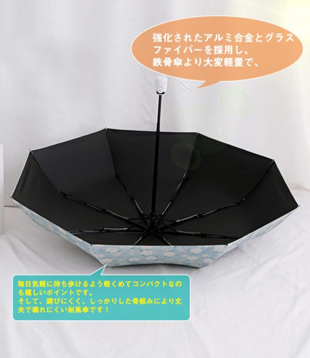 【強い日差しや紫外線からお肌を守る!】裏側はUVカットノリコーティングと断熱黒ノリコーティングを採用して紫外線対策に効果的な日傘です。UVカット率100%・UPF50+で有害な日差しからお肌を守ります。さらに強い日差しを遮り炎天下でも涼しく過ごせる遮光率100%の完全遮光です。【丈夫な折り畳み傘!】強化されたアルミ合金とグラスファイバーを採用し、鉄骨傘より大変軽量で、毎日気軽に持ち歩けるよう軽くめてコンパクトなのも嬉しいポイントです。そして、錆びにくく、しっかりした骨組みにより丈夫で壊れにくい耐風傘です!適度な厚みと弾力性があるので、強風を受けて万が一逆さに反しても傘