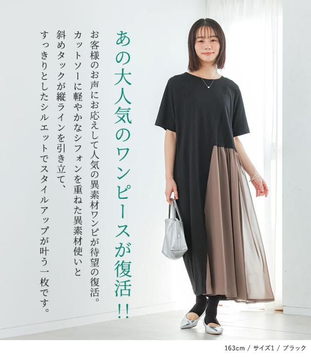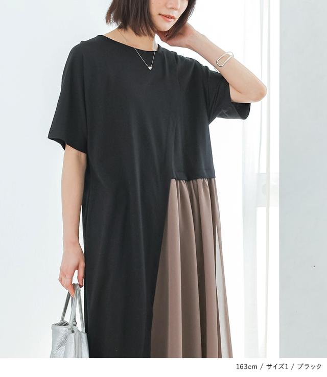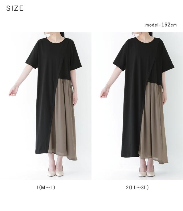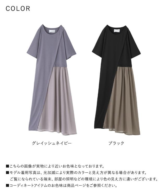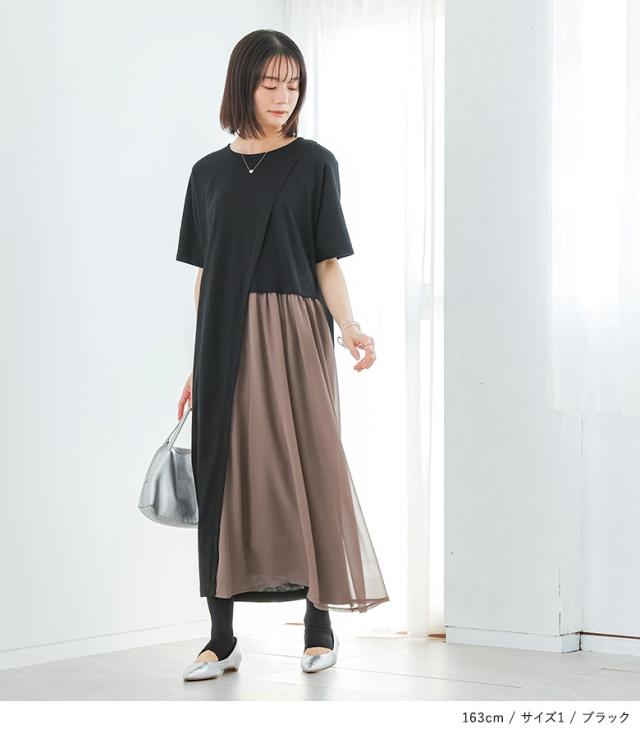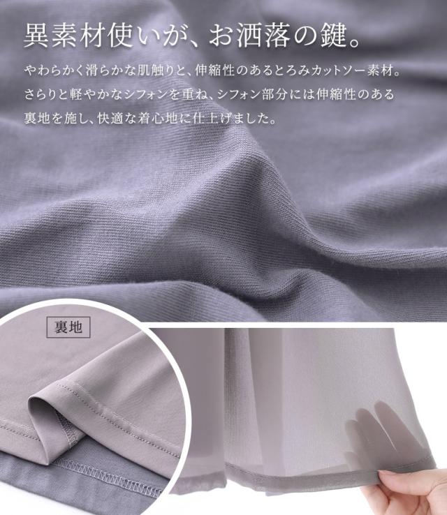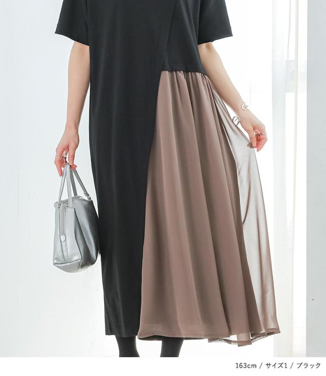 『配色シフォン切替カットソーワンピース』 ※メール便可※【10】[ワンピース ロング丈 レディース 春 夏 カットワンピース 半袖 五分袖 クルーネック シフォン シアー 透け感 フレア Aライン 異素材 体型カバー 着痩せ 二の腕カバー]