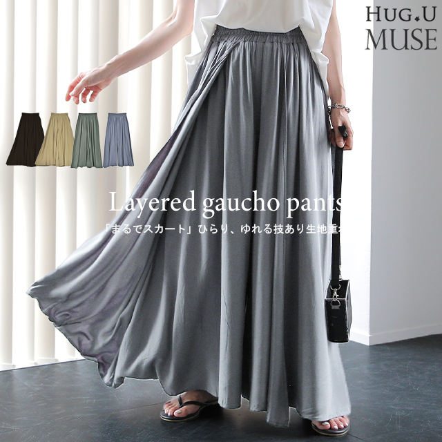 ワイドパンツ レディース パンツ 大人MUSE ガウチョパンツ 無地 ゴム ウエストゴム ズボン フレアパンツ フレア ボトムス ロング リラックス きれいめ フルレングス スカーチョ 体型カバー 大きいサイズ 夏 秋 秋新作