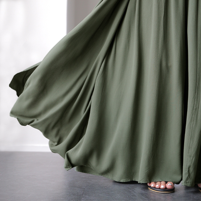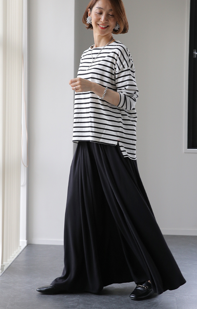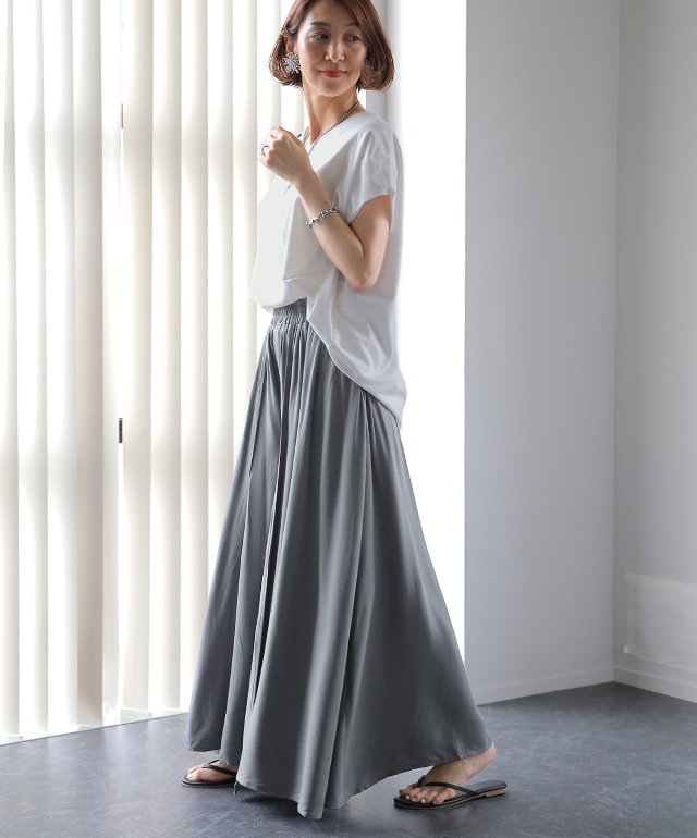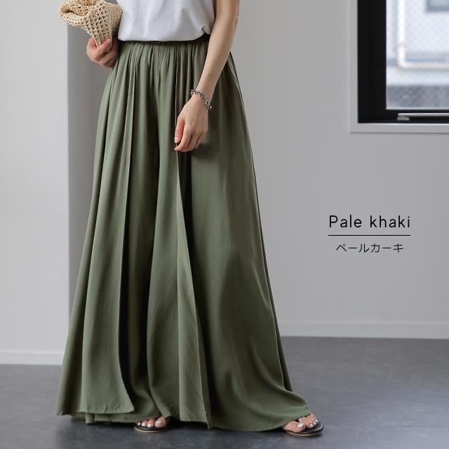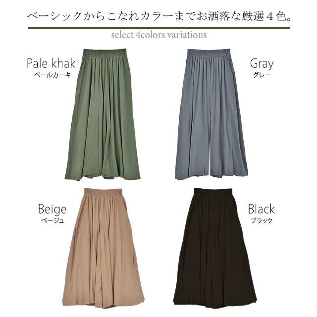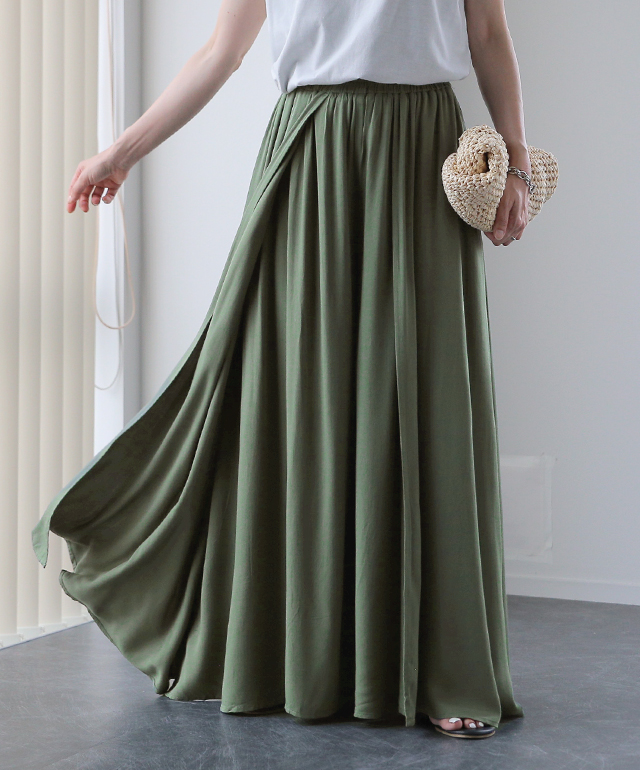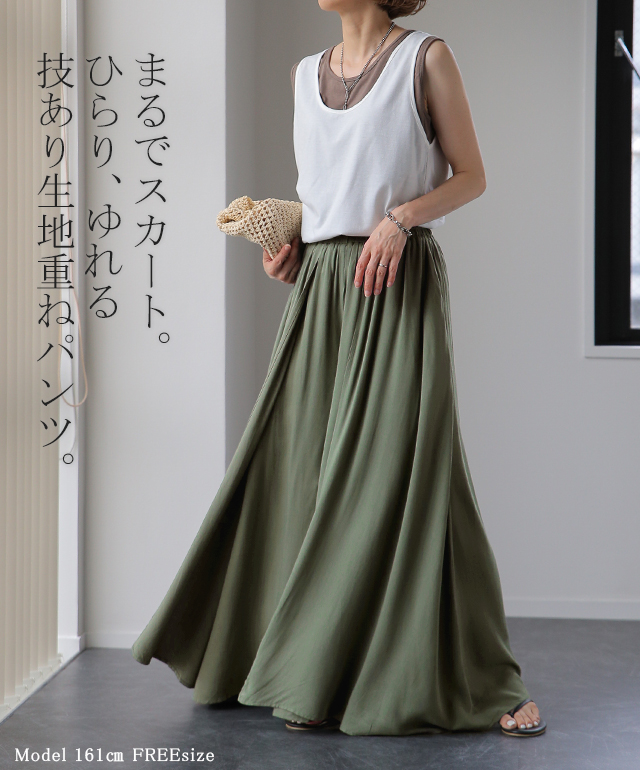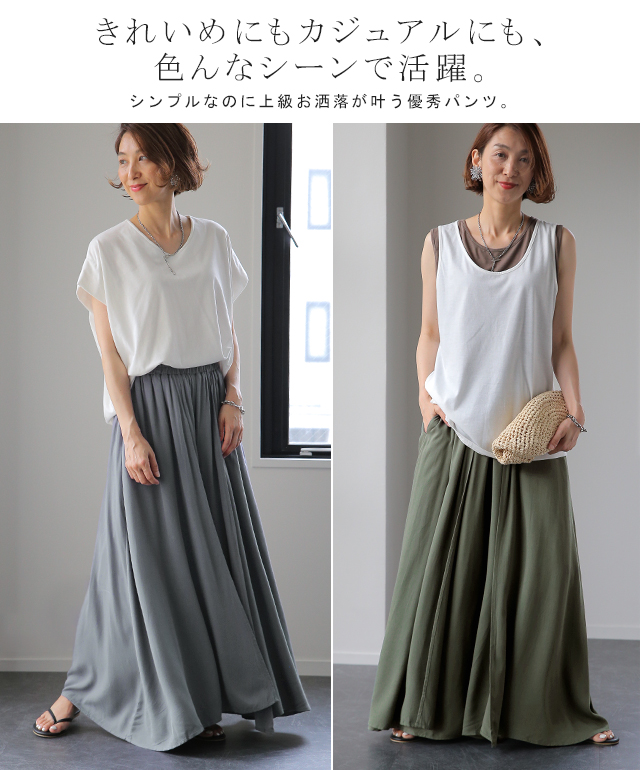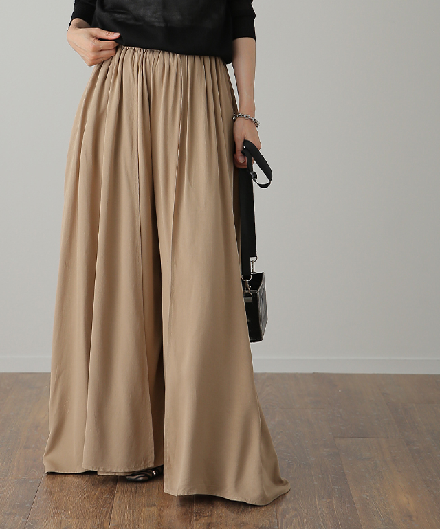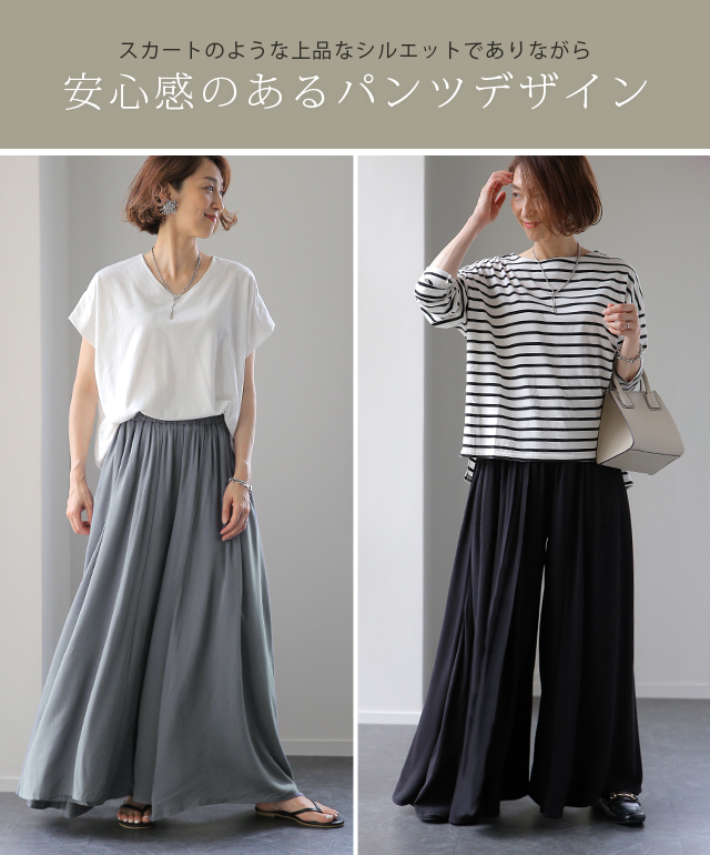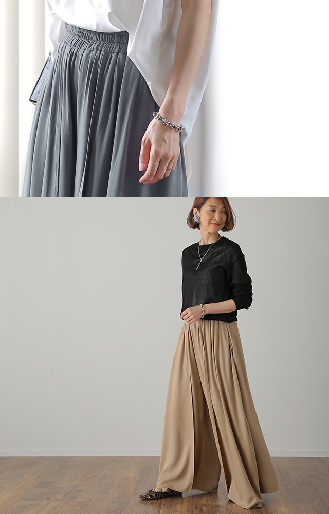 軽やかだけどボリューミーなシルエットで、体型をカバーしながら、ウエストゴムで楽ちんに穿いていただけます。
