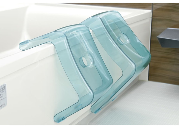 掛けて乾燥・収納できるバスチェア。浴槽のヘリに掛けられます。