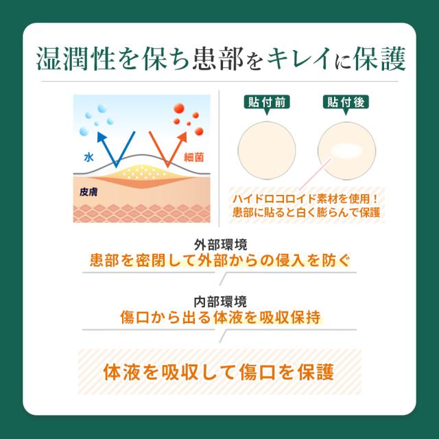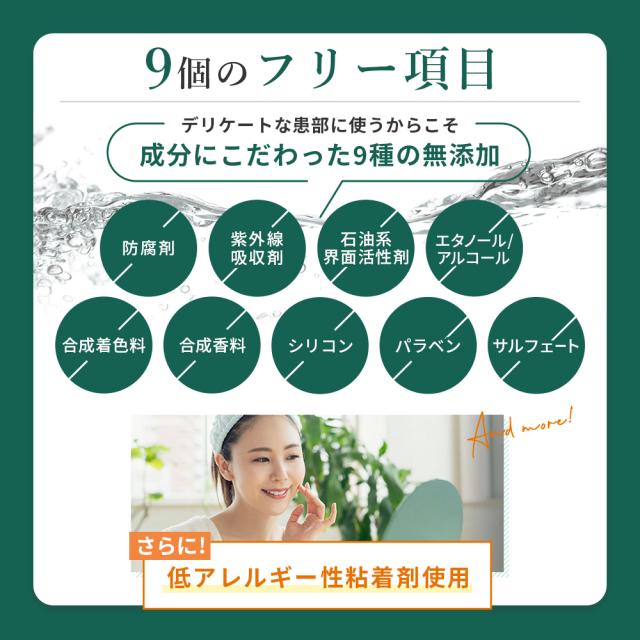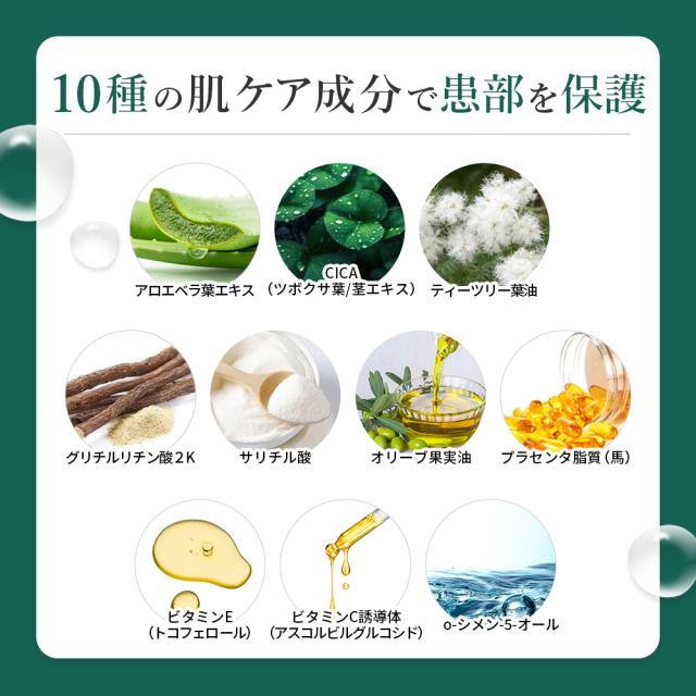 | 成分 | ハイドロコロイド、o-シメン-5-オール、サリチル酸、グリチルリチン酸2K、ティーツリー葉油、トコフェロール、アスコルビルグルコシド、ツボクサ葉/茎エキス、プラセンタ脂質、オリーブ果実油、アロエベラ葉エキス |