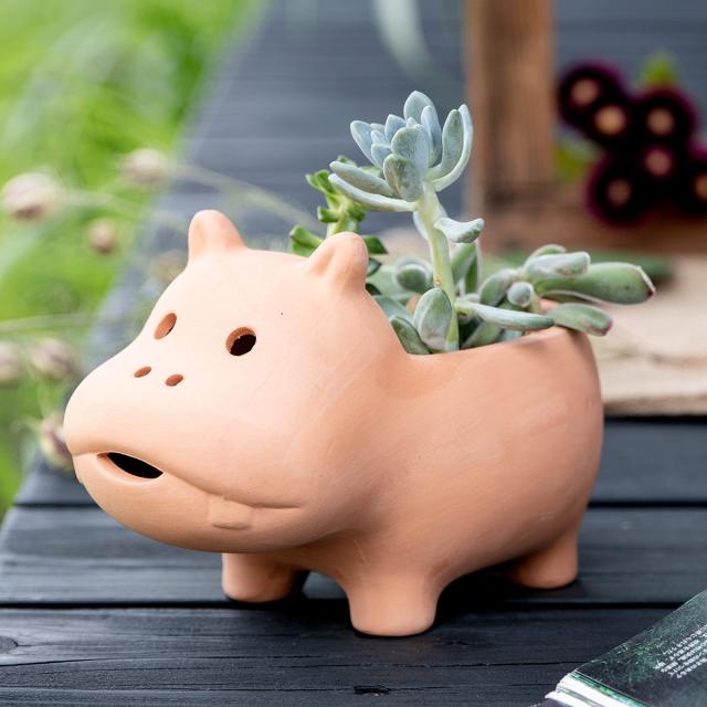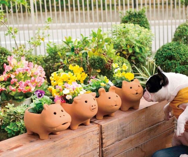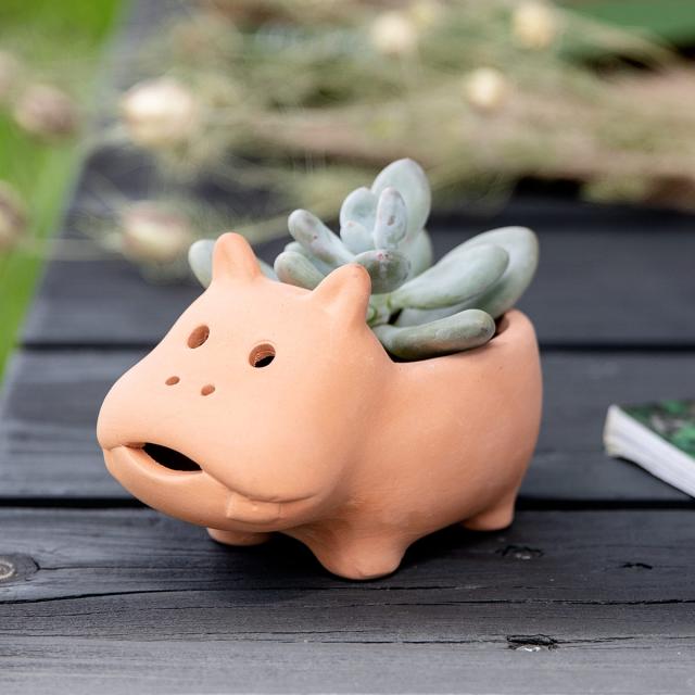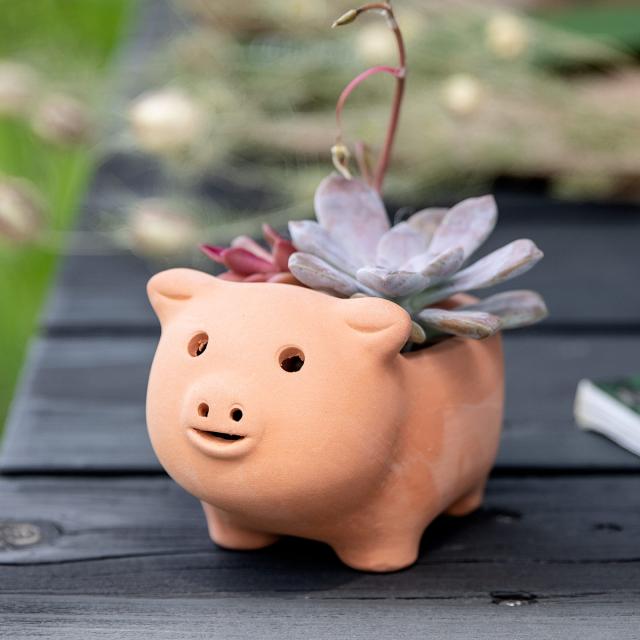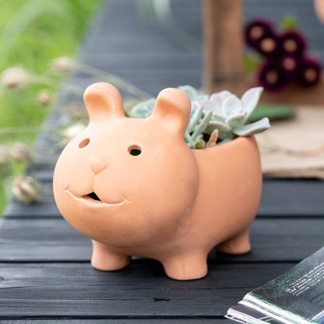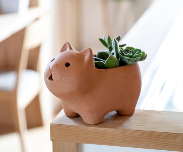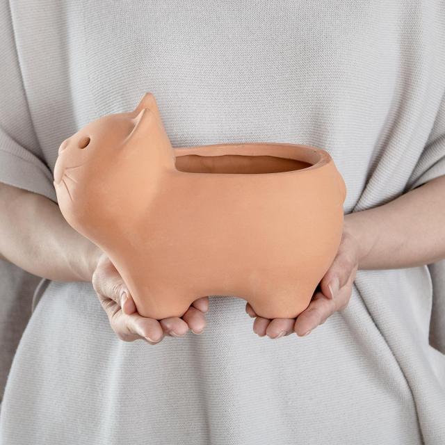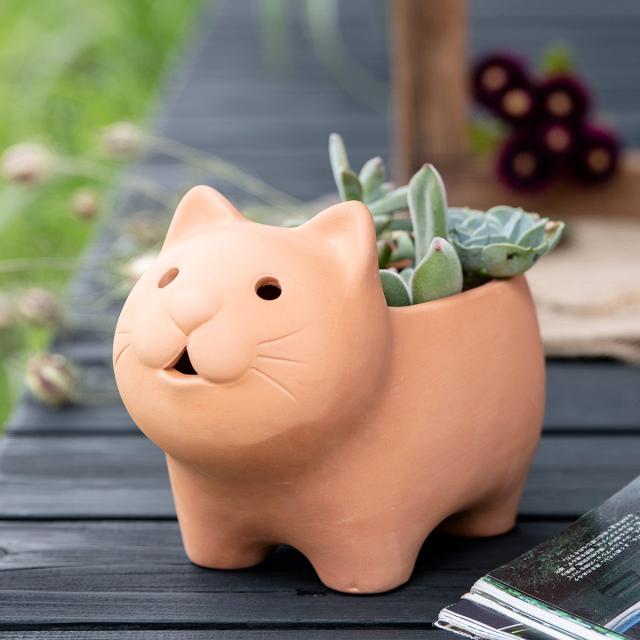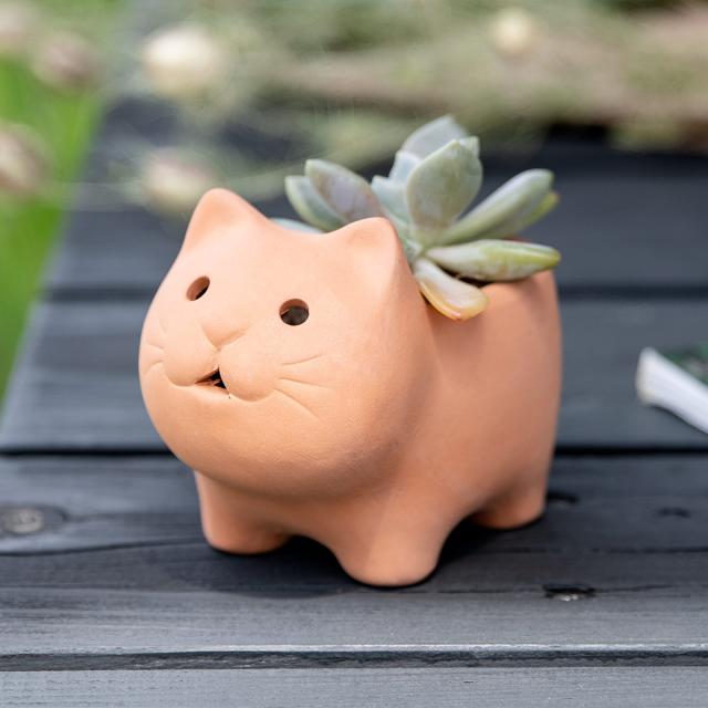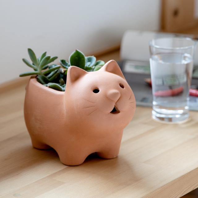 ネコをモチーフにしたテラコッタポットです。愛らしい表情とテラコッタの色味によく映えるグリーンやお花をずっと眺めていたくなりそうです。