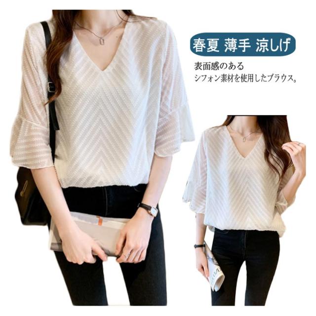 ブラウス レディース シフォン ブラウス 半袖 Vネック 涼しげ 涼しい シフォン素材 トップス フレア袖 フレアスリーブ Tシャツ 体型カバー 春夏 薄手 ゆったり カジュアル 無地 おしゃれ かわいい オフィス 通勤 通学 20代 30代 40代 送料無料