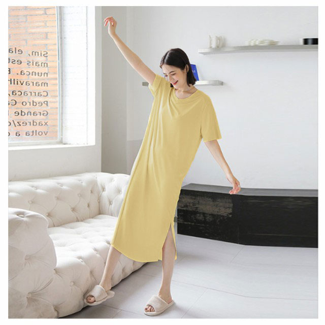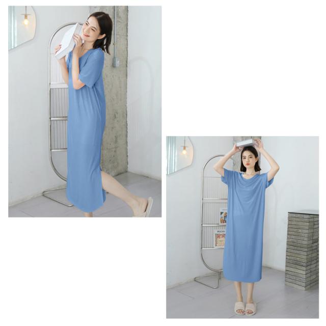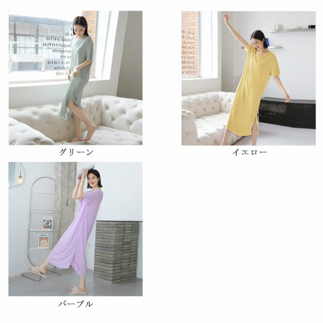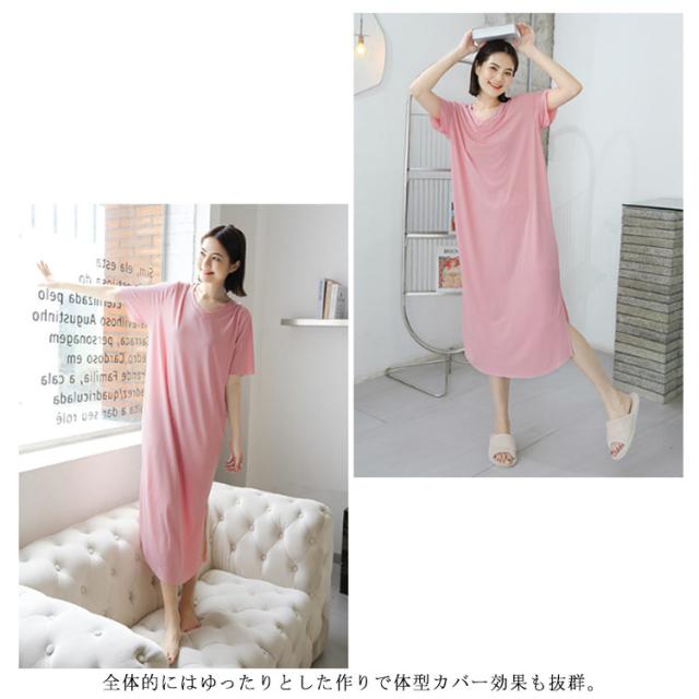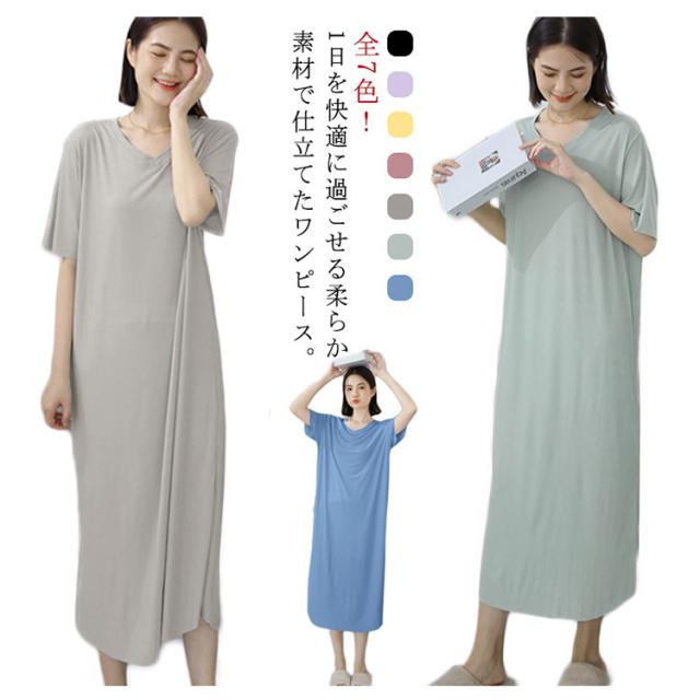 全7色!ルームウェア ワンピース 部屋着 ロング おうち パジャマ 大きいサイズ 無地 ワンピースパジャマ 体型カバー シンプル インナー ストレッチ マタニティ ナイトウエア 膝下丈 Vネック 夏 秋 春 薄手